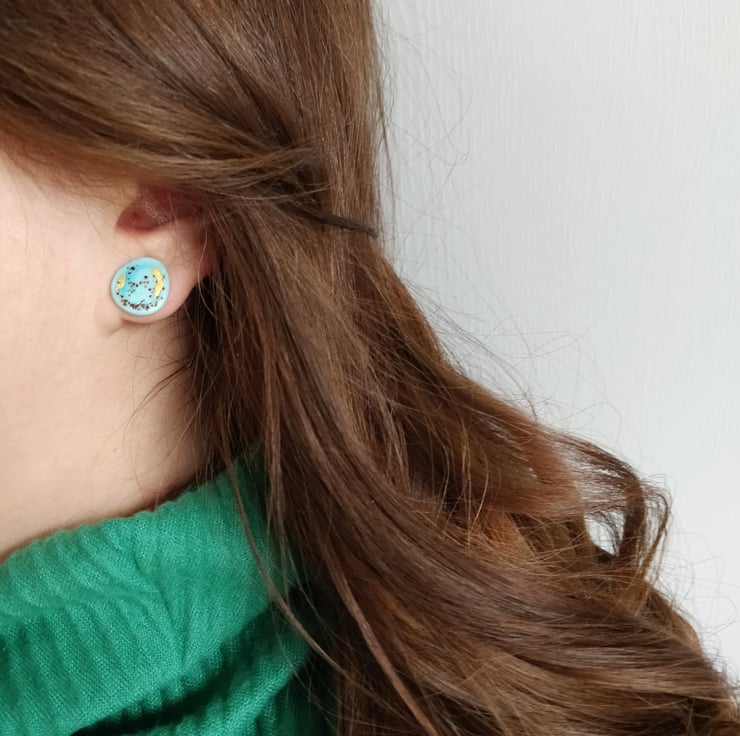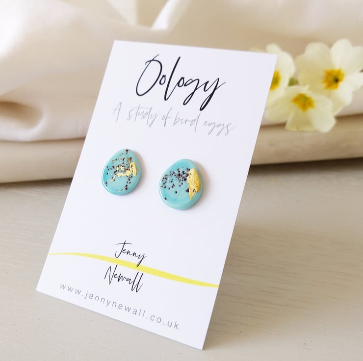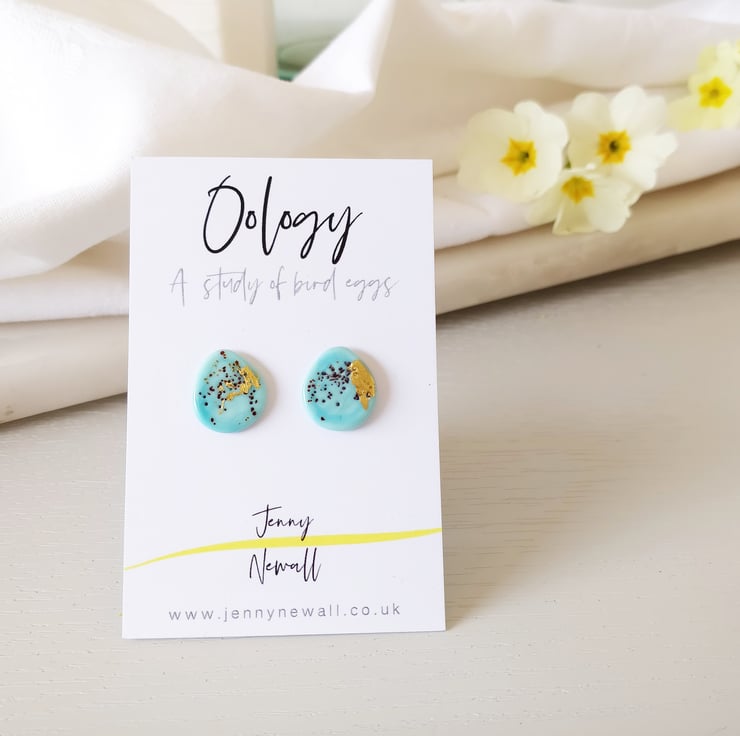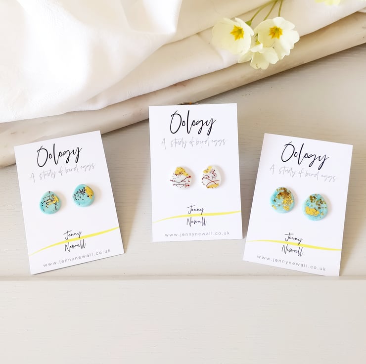 Pictured are a pair of statement glass studs that have evolved from my watercolor impressions of British bird eggs. When you purchase a pair of earrings you will recieve a story card which depicts the origins of the collection.