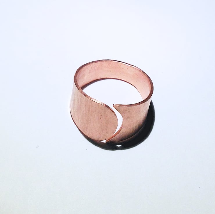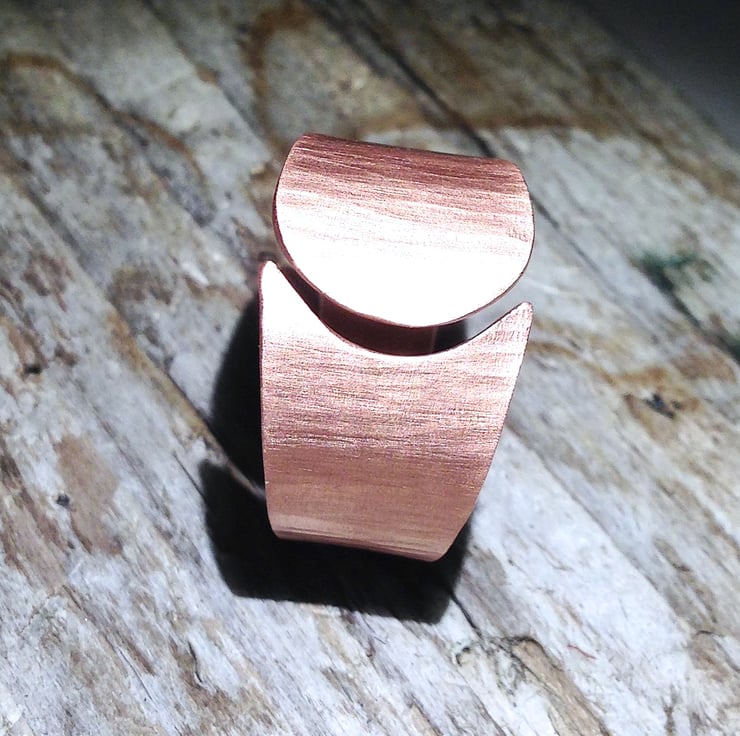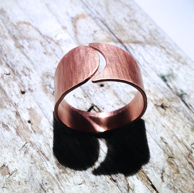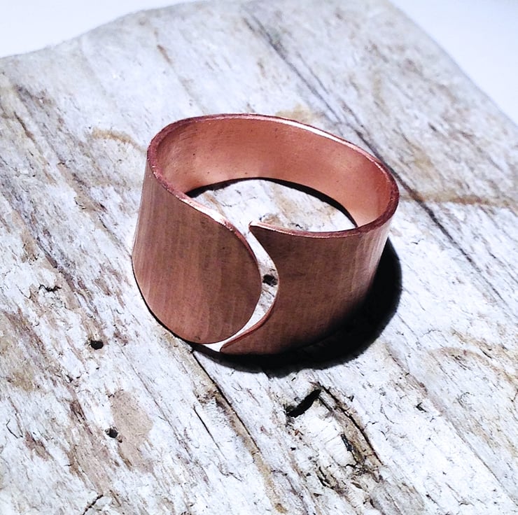 I have handmade the ring by sawing the shape from sheet copper. I have given it a hammer textured and brushed finish.