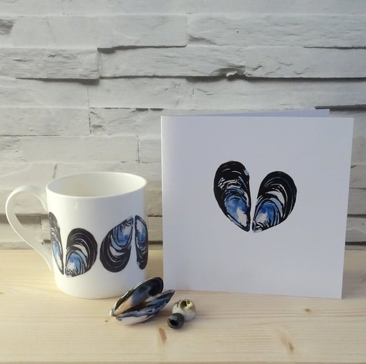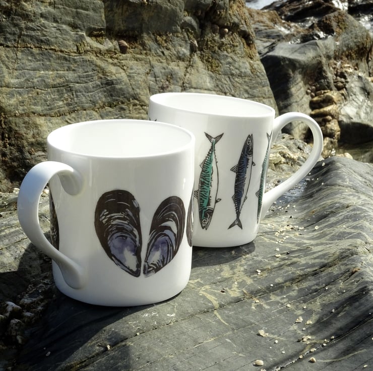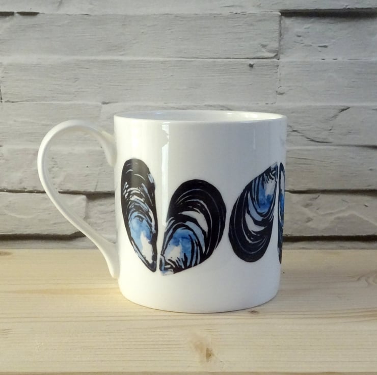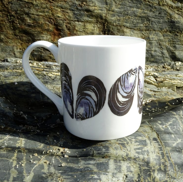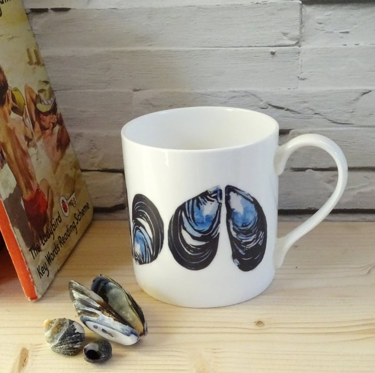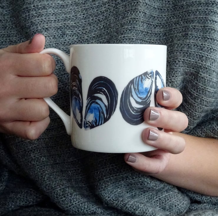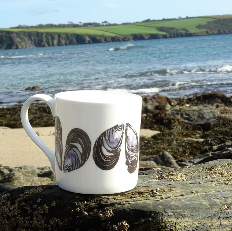 Stylish bone china ceramic mug, featuring a repeating mussel shell design. Give your home a stylish coastal feel.