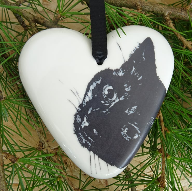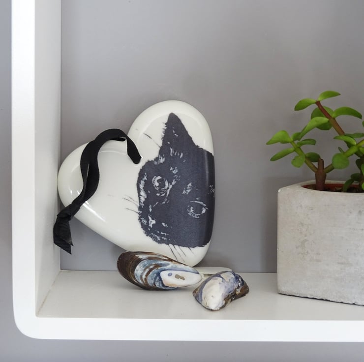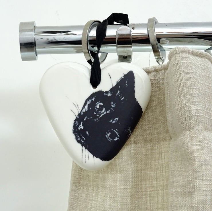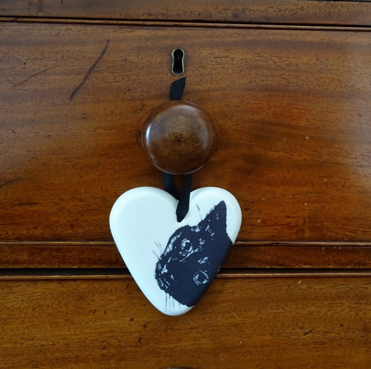 This stylish white ceramic heart is decorated with a cute lino cut black cat, who's cheekily peeping from the edge.