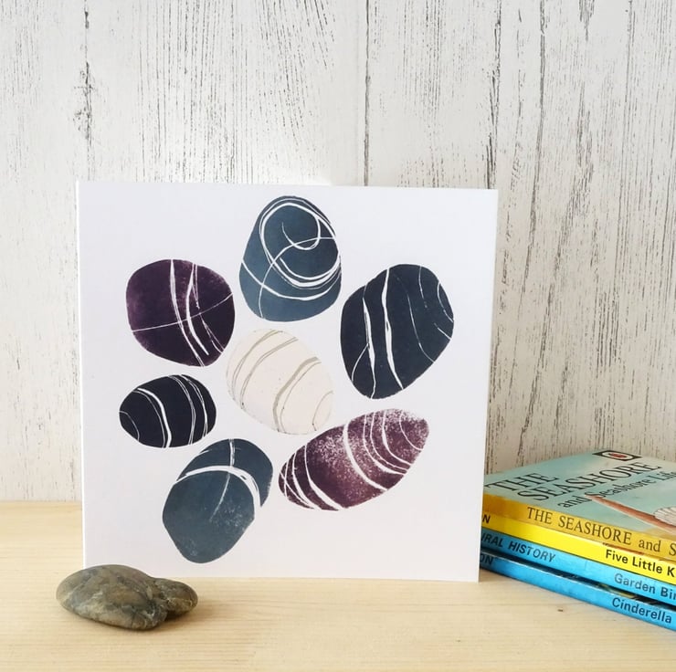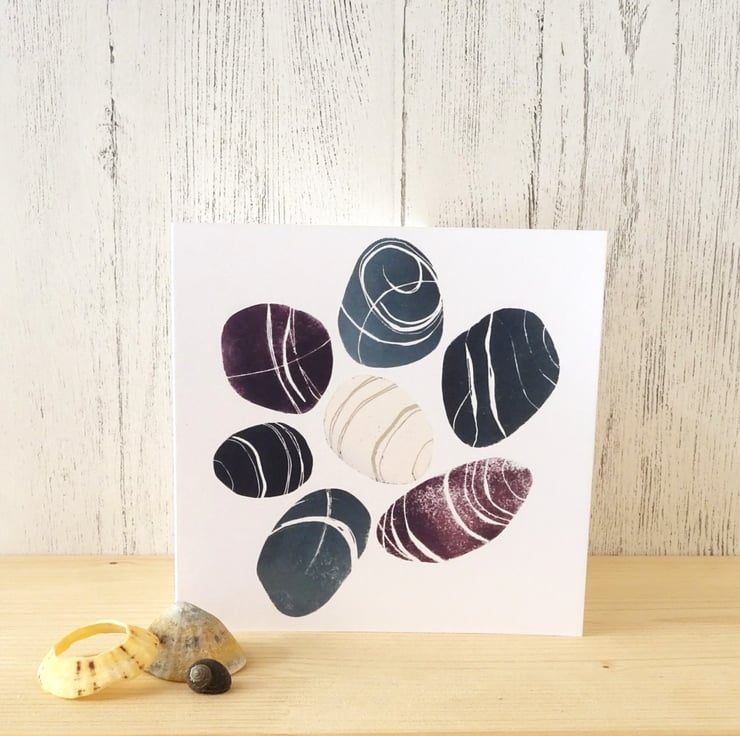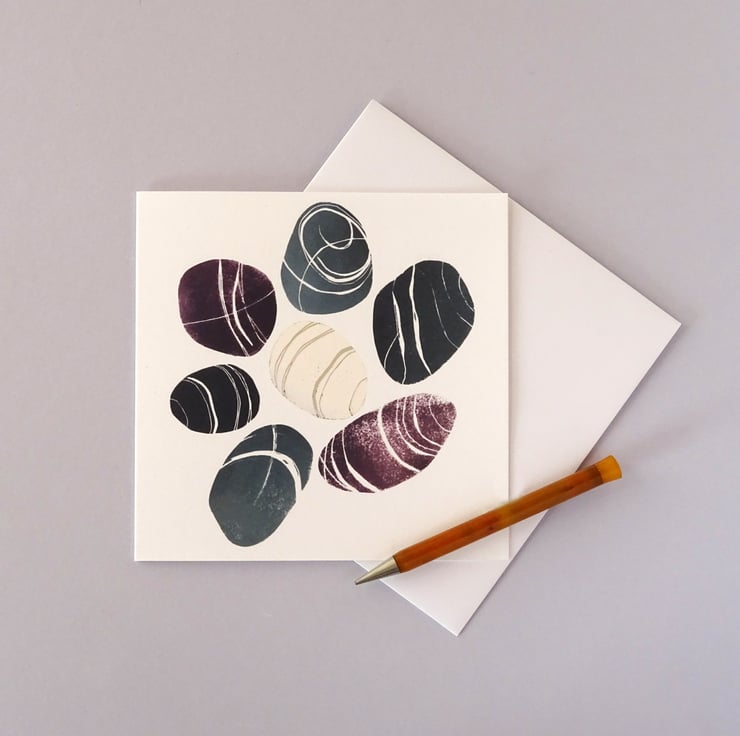 A professionally printed art card from an original linocut featuring Cornish beach pebbles. Perfect to remember days at the coast or to celebrate an anniversary, birthday or any other occasion.