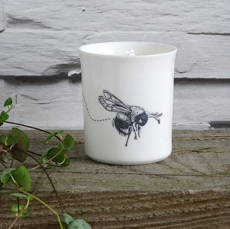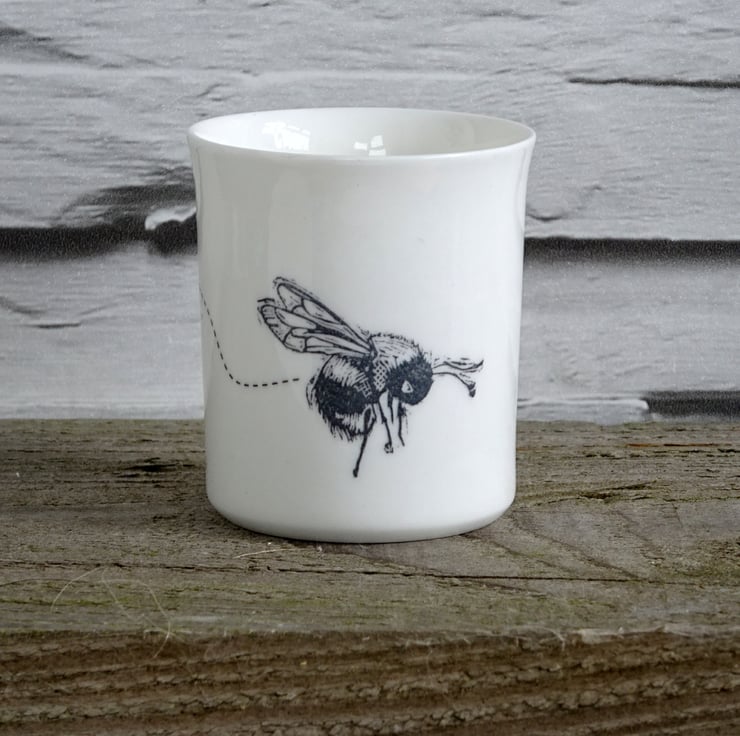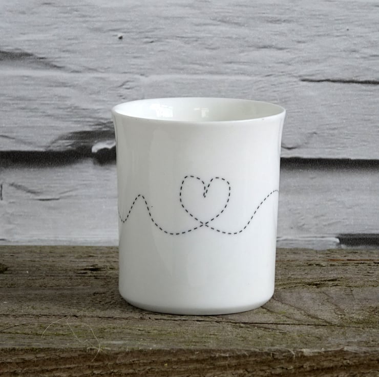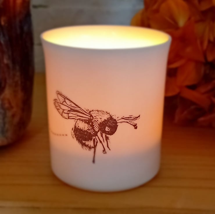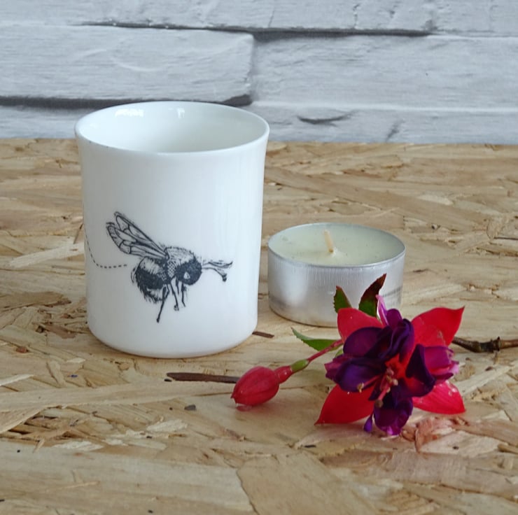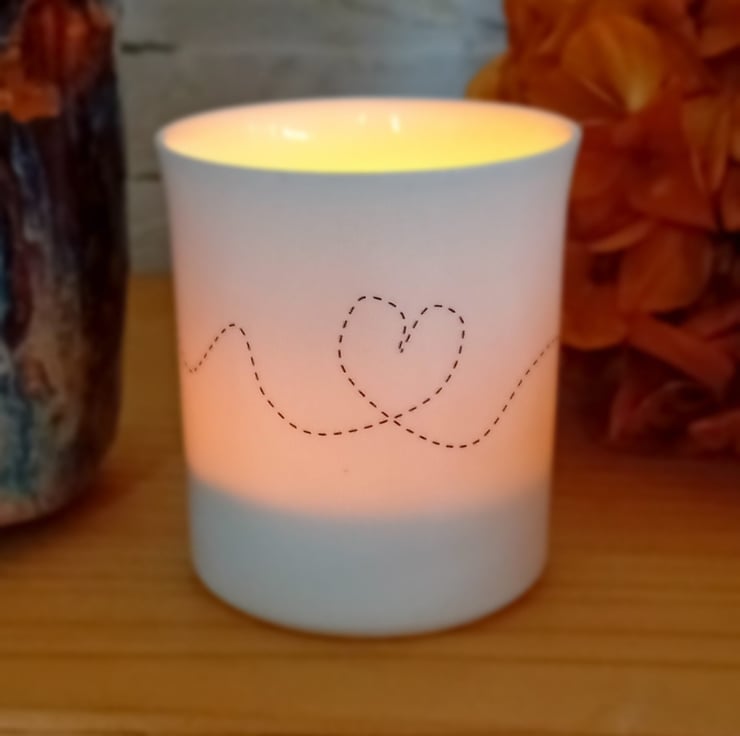 This stylish white ceramic tea light holder is decorated with a lino cut bee and cute heart.