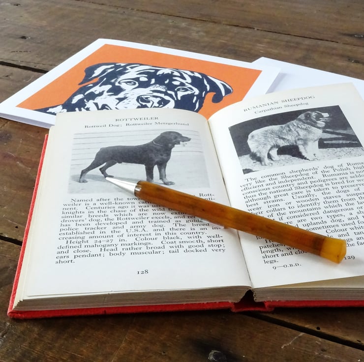 This design is taken from a lino cut, hand carved by me. It's perfect for all rottweiler lovers out there.