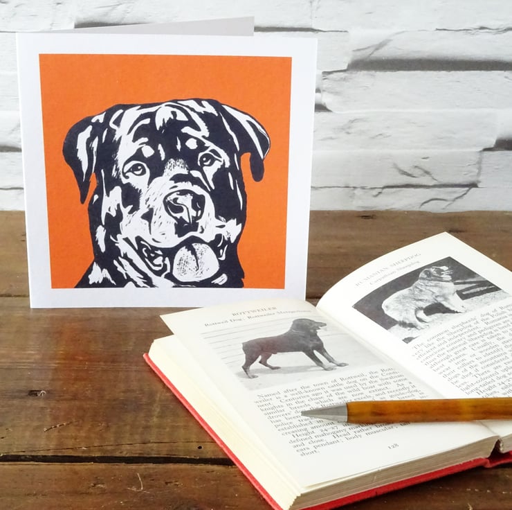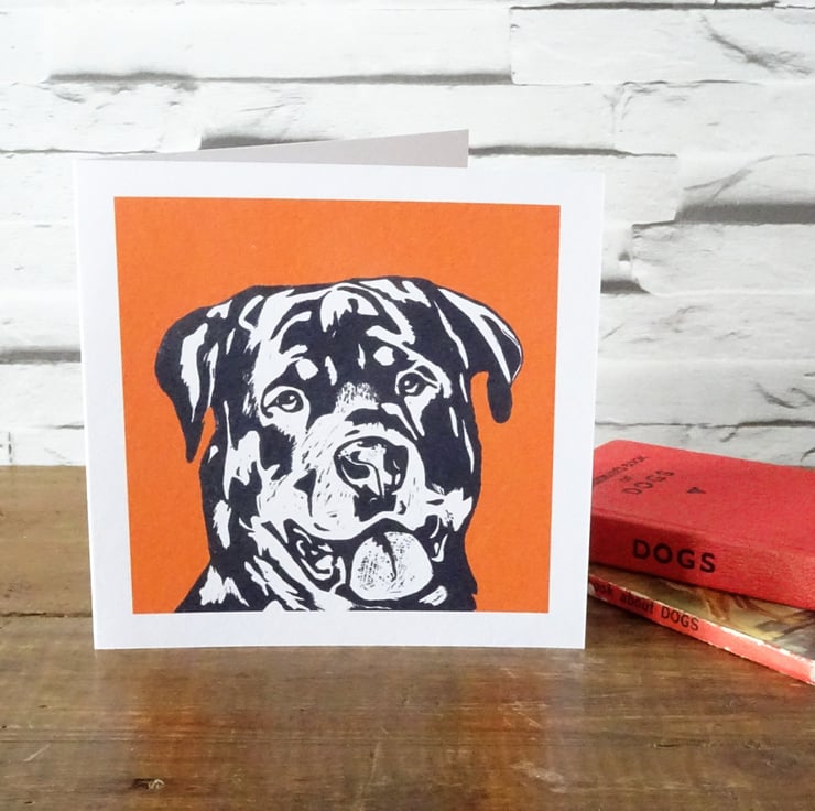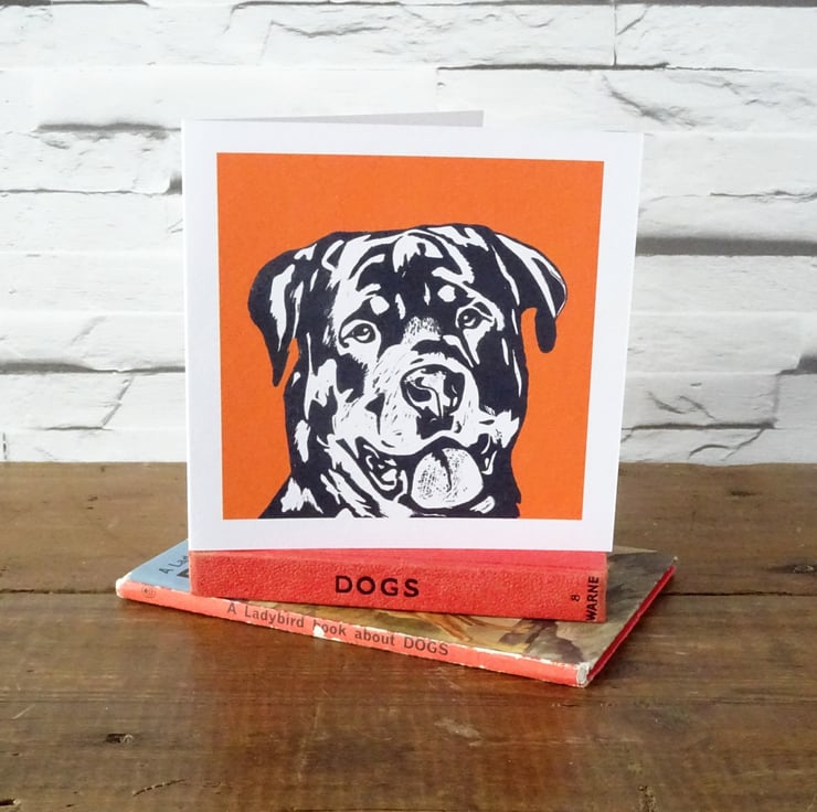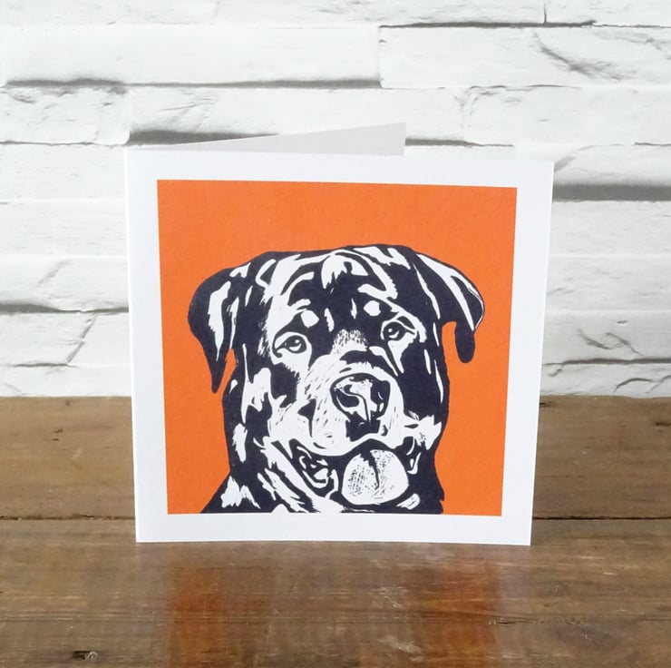 Striking greeting card featuring a beautiful rotty. A professionally printed art card from my original linocut, suitable for occasions such as birthday, congratulations, thank you, sorry, etc.