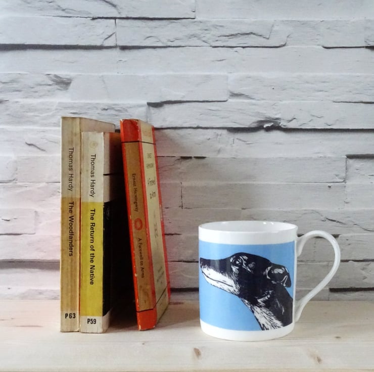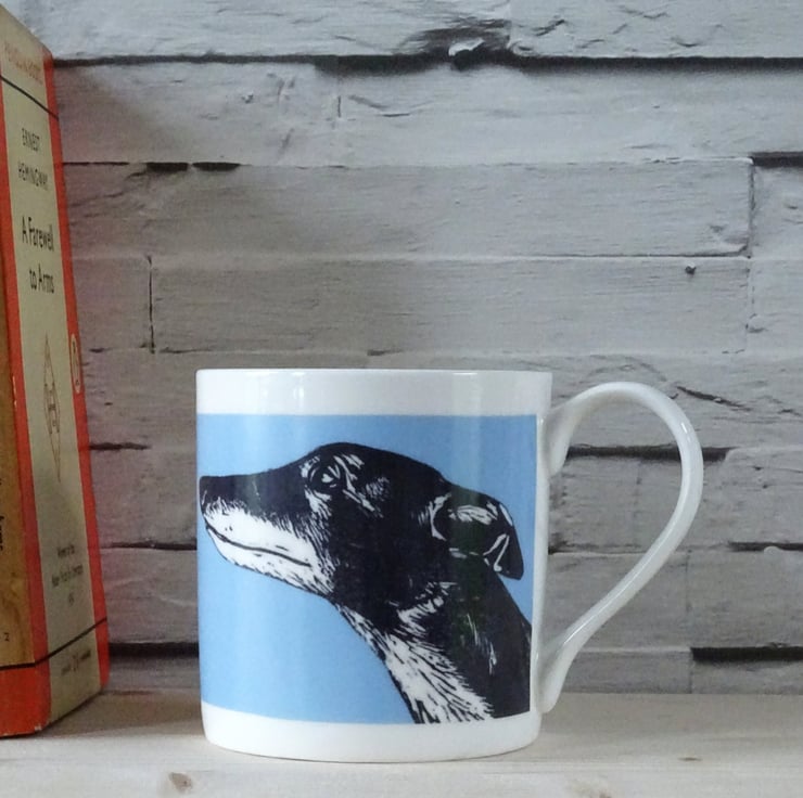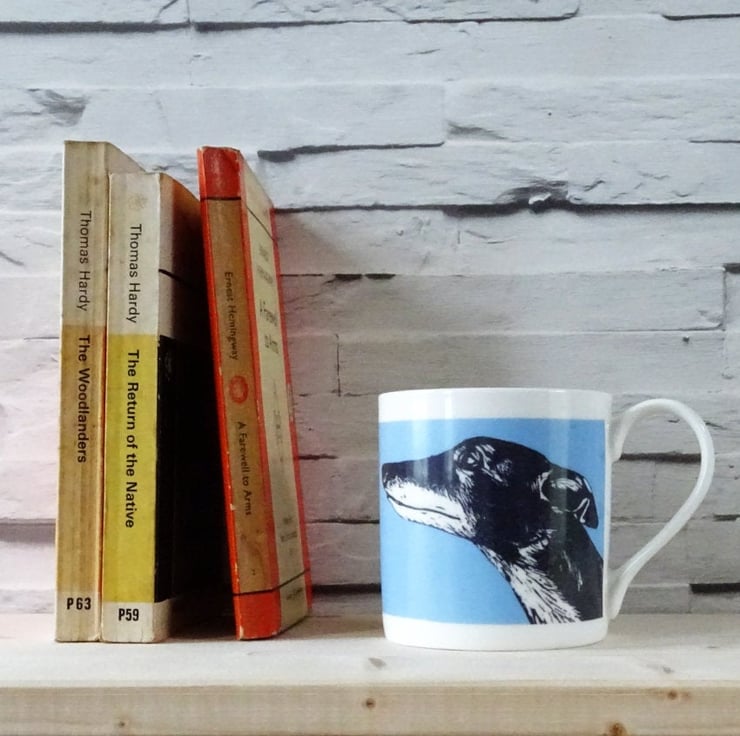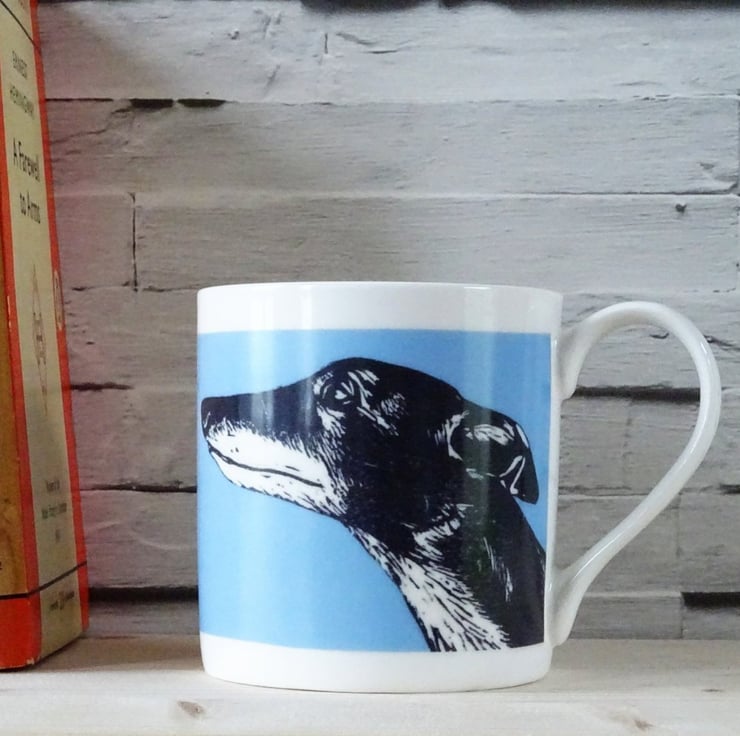 Stylish ceramic mug, featuring a gentle sighthound, gazing adoringly. Perfect for any sighthound fan, whether they love greyhounds, whippets, lurchers or galgos!