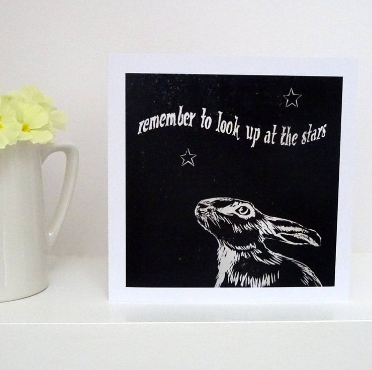 A professionally printed art card from an original lino cut, featuring a stargazing hare and the 'remember to look up at the stars' quote.