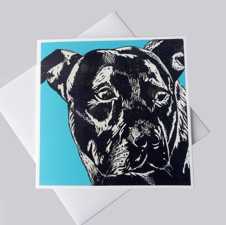 A professionally printed Staffie card from an original linocut, perfect for birthdays or just to say hello.