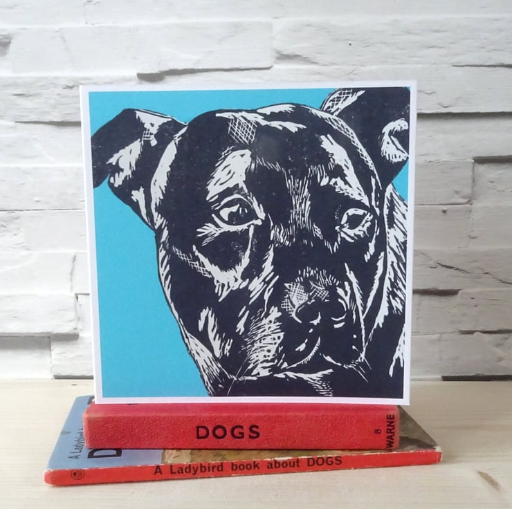 This design is taken from a hand carved lino cut, made by me of an intelligent Staffordshire Bull Terrier- look at those eyes! Perfect for fans of these loyal, affectionate dogs.