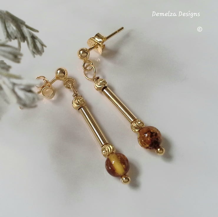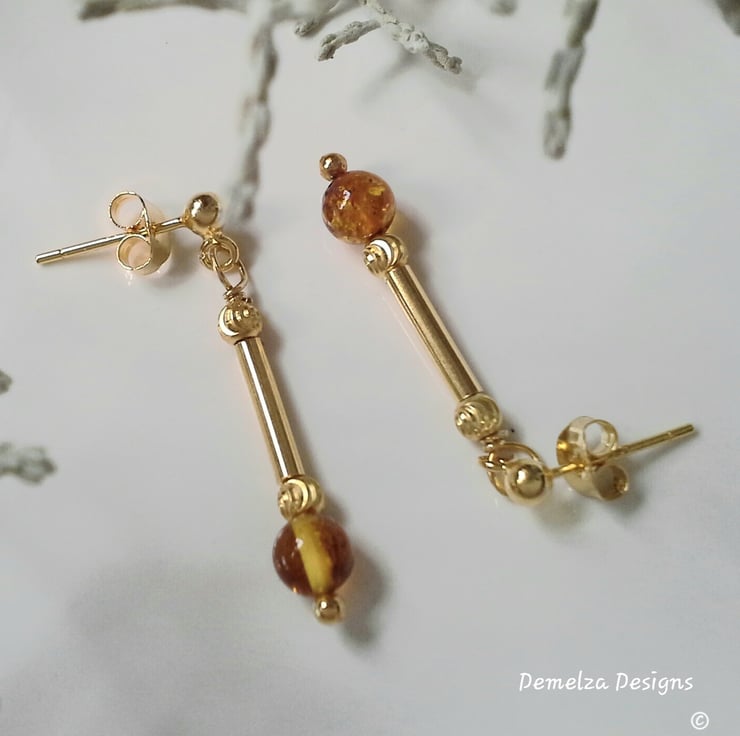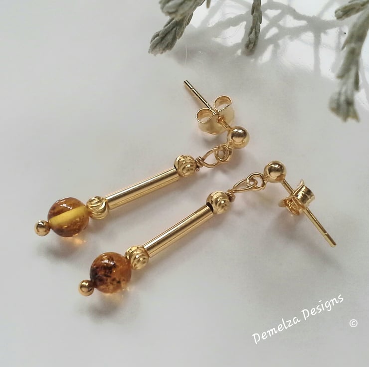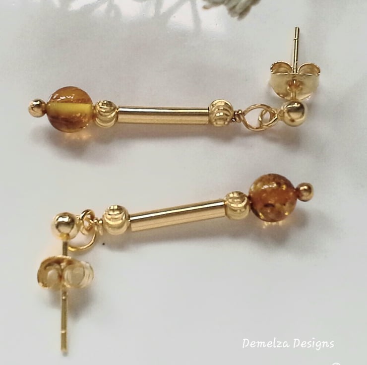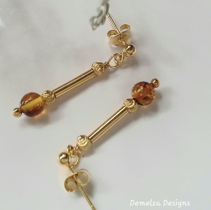 A very warm glowing dainty pair of earrings designed and hand crafted using 6mm cut genuine Baltic amber rounds. All other components are yellow gold vermeil. All Demelza Designs findings are purchased from either their supplier's based in Birmingham or the London jewellery quarters whom are registered with the National Association of jewellers (NAJ) within the trade.