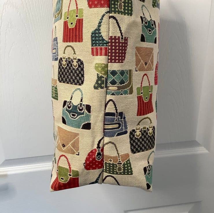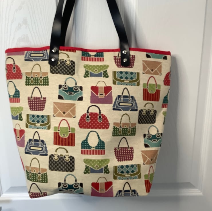 This eye catching tapestry fabric tote is also fully lined with red cotton fabric and has Brown leather handles,