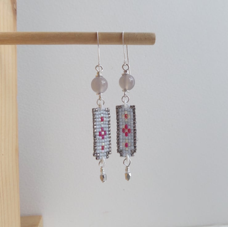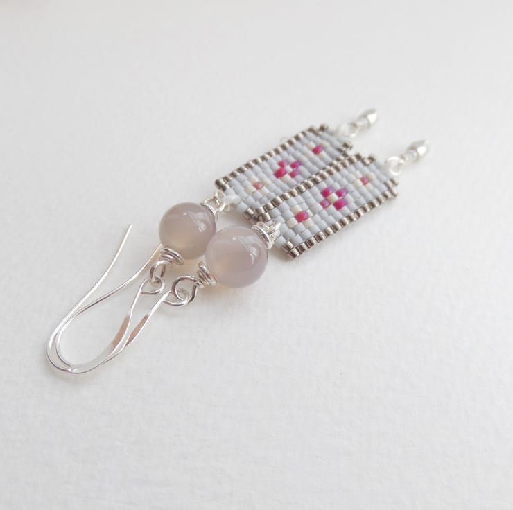 The stone at the top is a neutral grey agate, then light and gunmetal grey and touches of raspberry pink beadwork with a silver faceted bead to finish. Look closely and you'll notice some tiny iridescent beads around the pink ones.