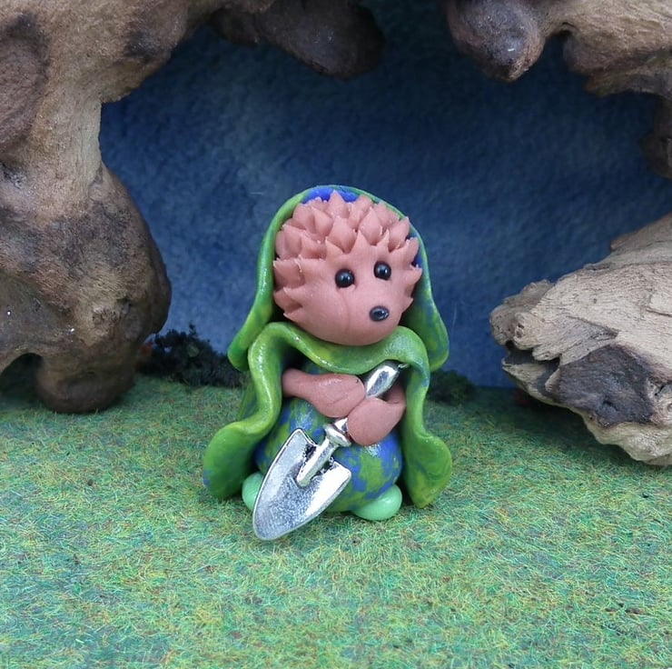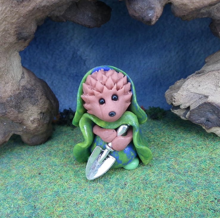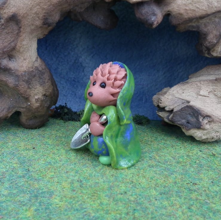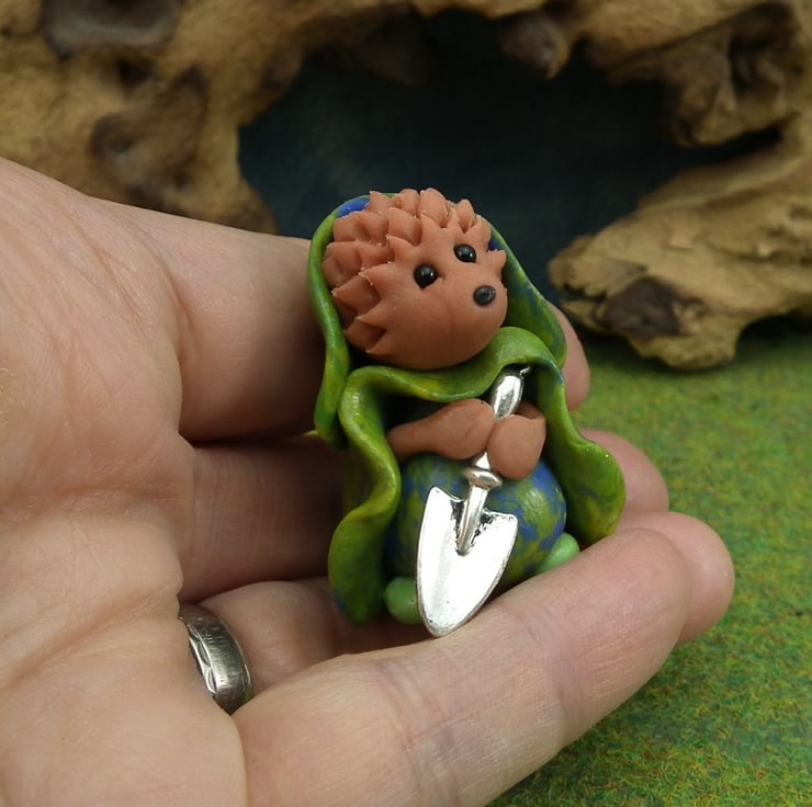 The High'n'Over Hedgehogs live quietly on the outskirts of the Gnome Village ... they have sweet natures and are adept at catching the most annoying insects, digging for the last Winter nuts and munching happily ... here is Hollie with her tiny silver shovel ...
