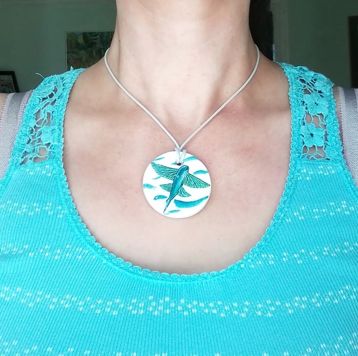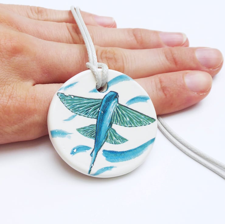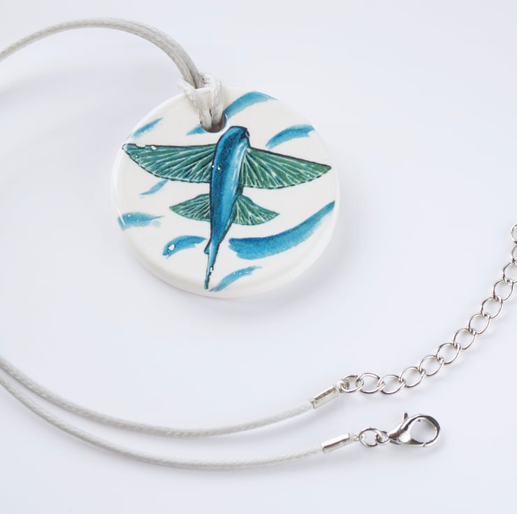 Handmade Flying Fish Ceramic Pendant on Light Grey Cord Necklace with Lobster Clasp and Extender Chain