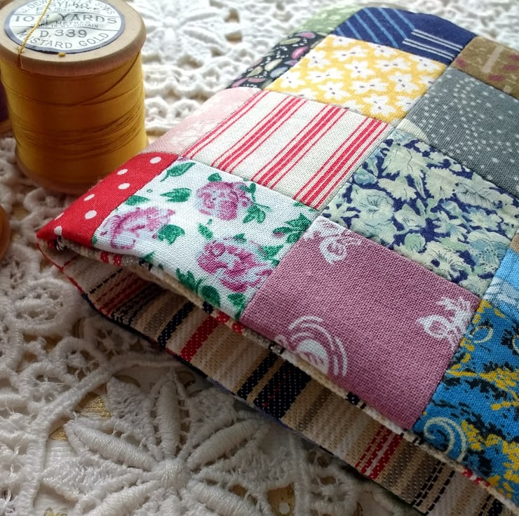 Made from an assortment of different fabrics, little pieces and the smallest scraps, handed down or left over from other sewing, all with their own history. Each patchwork needlecase is unique as they are made with different prints and colours.