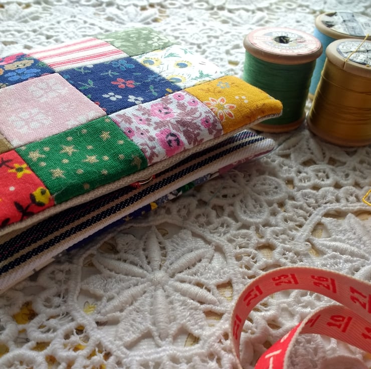 Made from an assortment of different fabrics, little pieces and the smallest scraps, handed down or left over from other sewing, all with their own history. Each patchwork needlecase is unique as they are made with different prints and colours.
