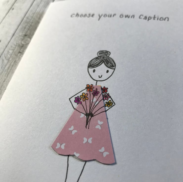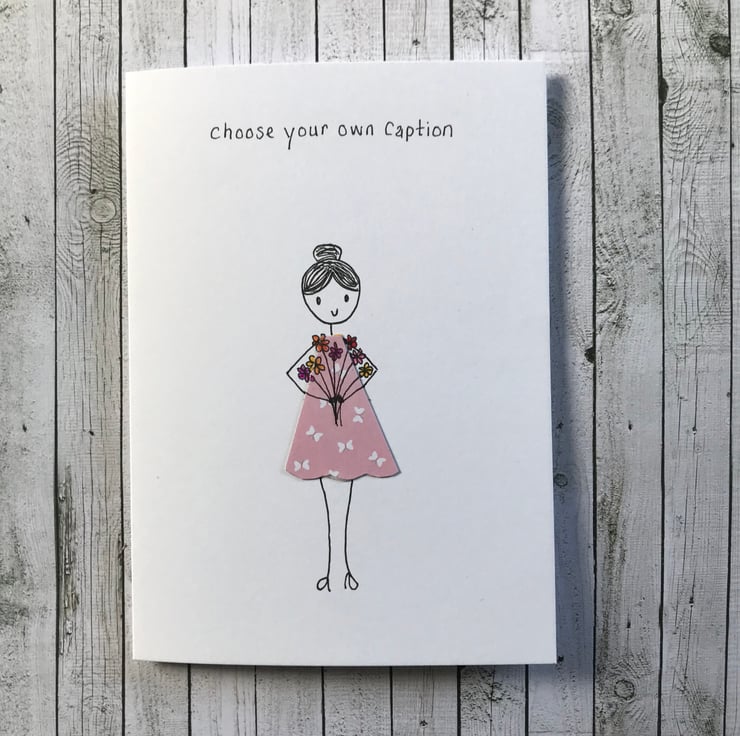 Hand drawn 'Lady with Flowers' greeting card. Choose your own caption for the front of the card eg Happy birthday, Happy birthday Claire, Wishing you a very happy birthday, Thank you, Sending you a huge big thank you. Simply send me your choice of words when you place your order.