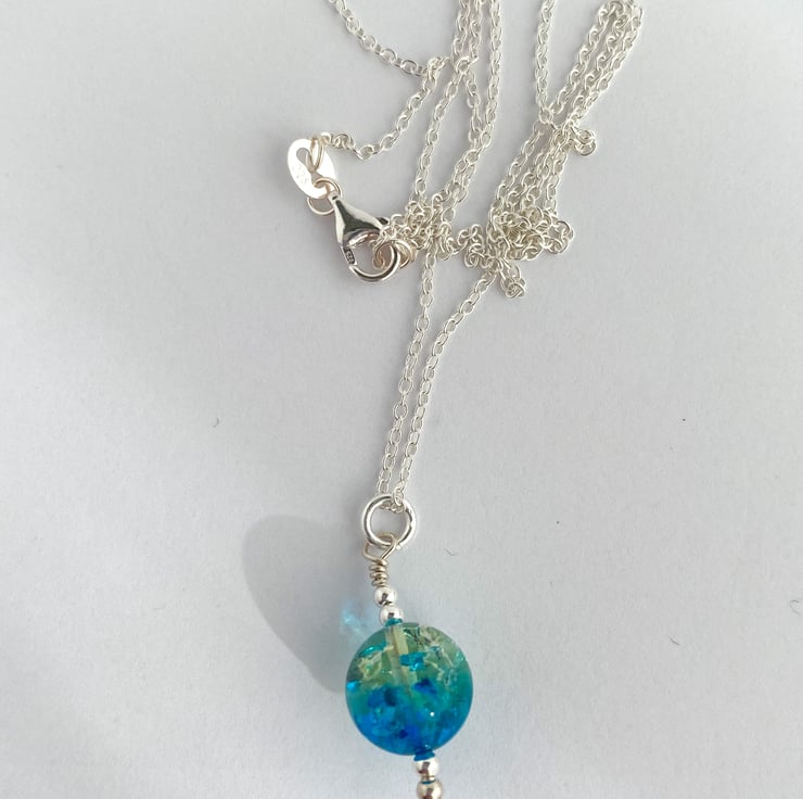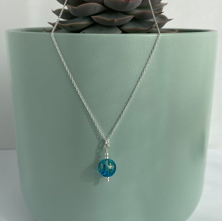 This piece is a large 10mm in size, framed by sterling silver accent beads and suspended from an 18in sterling silver chain.