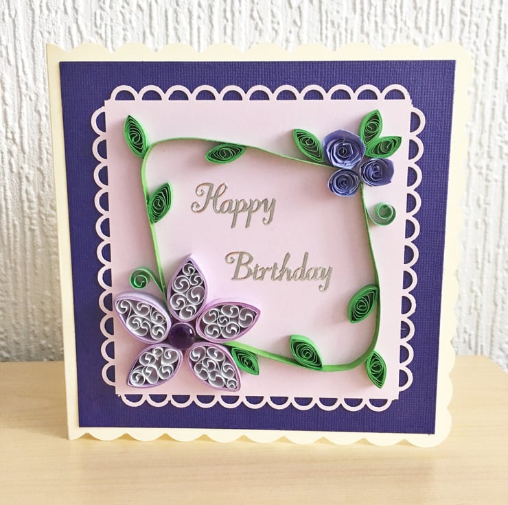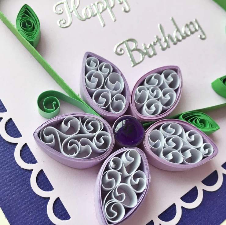 This card features a larger quilled lilac flower with a purple epoxy centre in one corner and a cluster of purple roses in the other. The scalloped mat sits on a purple background and the card says Happy Birthday in silver foil letters. Inside the card is blank for you to write your own greeting.