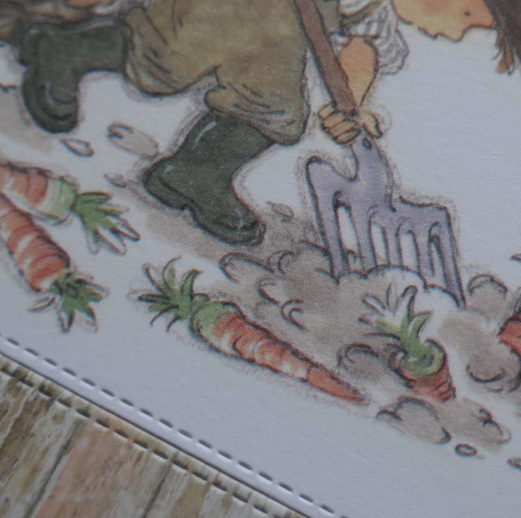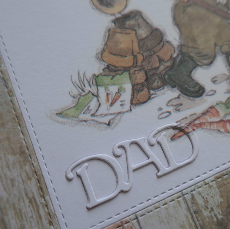 A piece of wood effect patterned paper has been attached to the front of the card leaving a white border around the edge and a stitched rectangle in the centre. A cute Lili of the Valley precoloured image of a boy digging a garden has been inlaid into the frame. 'DAD' has been die cut and layered along the lower edge of the image.