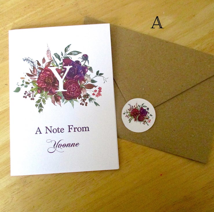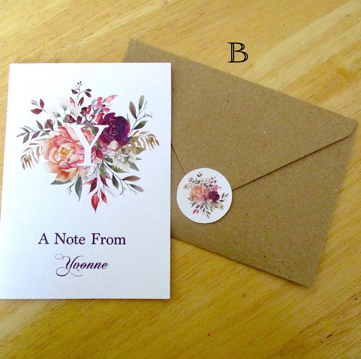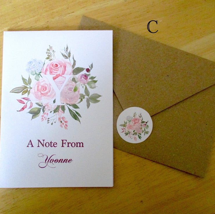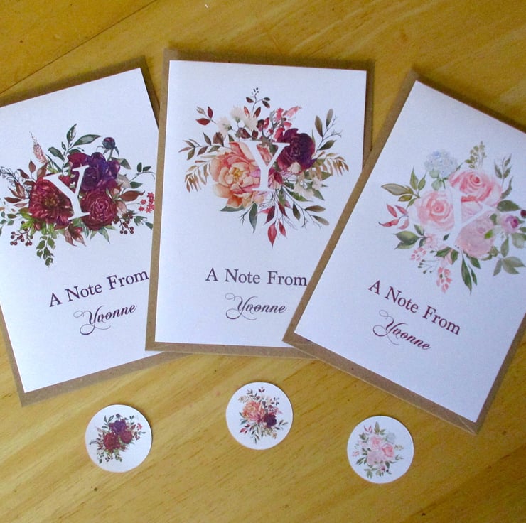 Lovely pack of floral personalised folded notelets with matching envelope stickers and plain kraft envelopes
