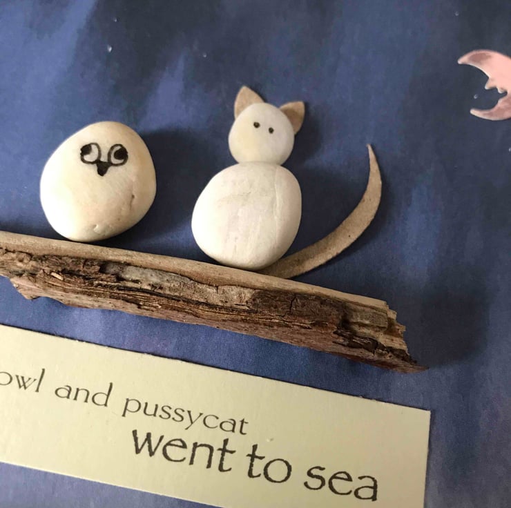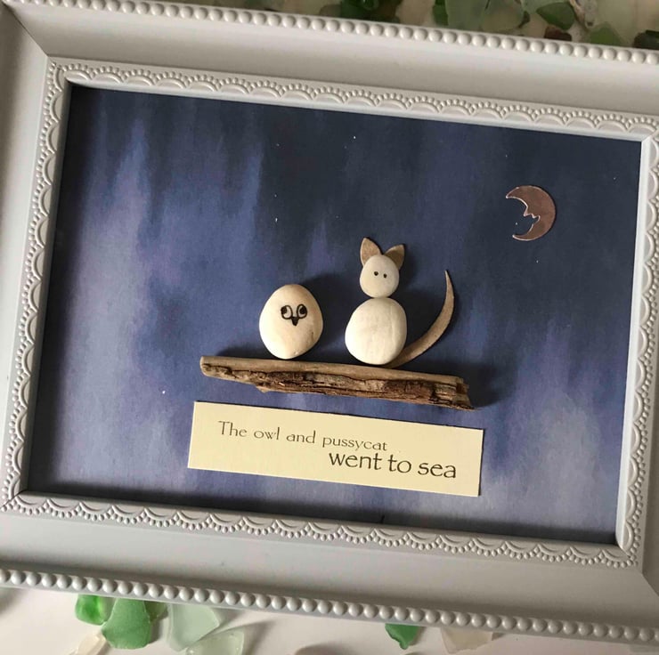 Framed pebble art featuring words from the famous nursery rhyme ‘the owl and the pussycat’ and pebbles forming the owl and the pussycat sat upon some driftwood... a bright moon shines down on them.