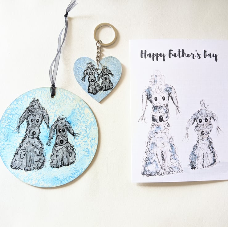 - A wooden heart shaped keyring - circa 5cm, with a painted illustration of the same cute dogs - personalised with your choice of name on the back. This is sprayed with a protective finish after painring