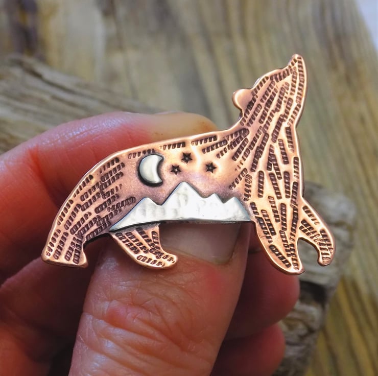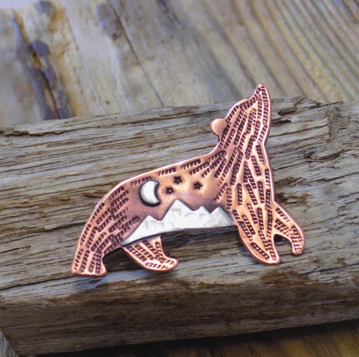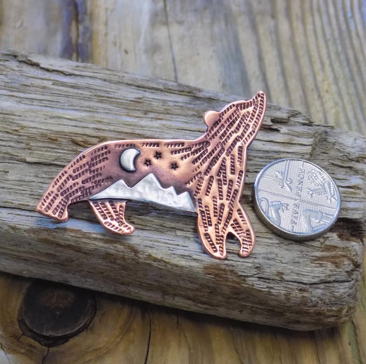 Made from copper and sterling silver sheet. Hand sawn, filed and sanded smooth. The silver mountains have been carefully soldered onto the copper and given a little texture. A little silver moon and stars have been added to set the scene ,and the rest of the bear has been textured with individual punch marks to give the impression of fur.