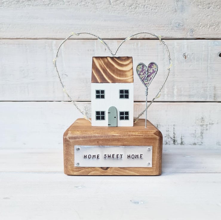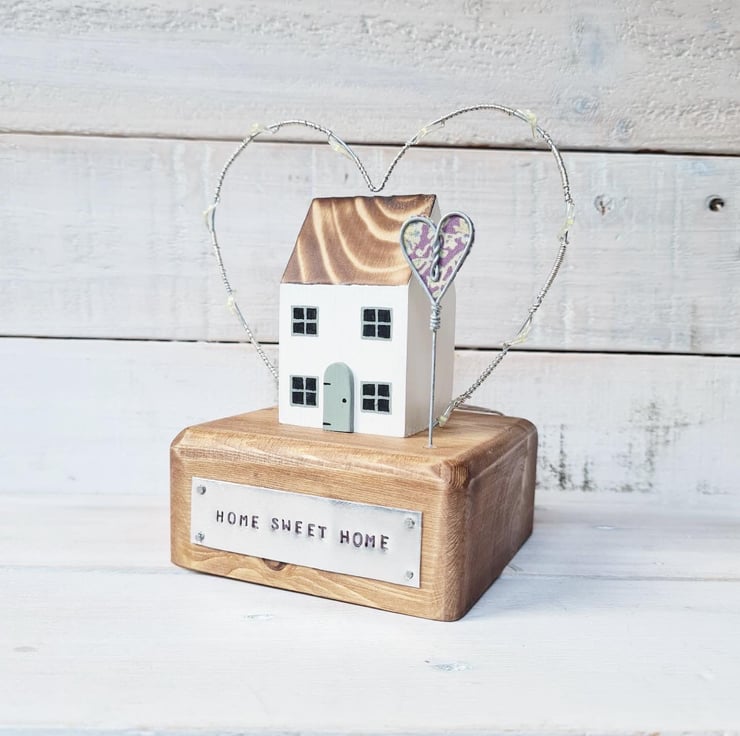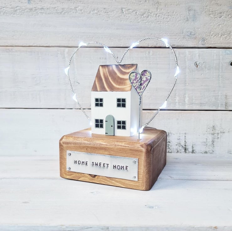 Crafted by hand from wood with wire heart arching over house with mini fairy lights and wire/fabric heart. Home Sweet Home is stamped on a metal plaque