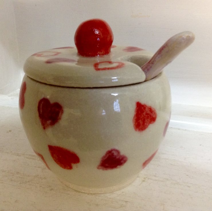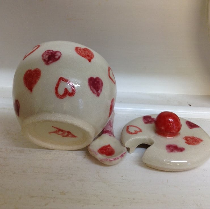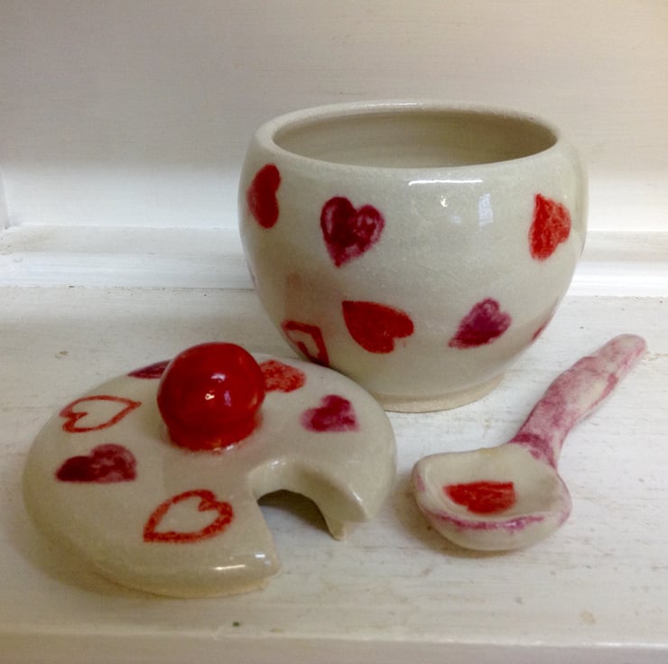Gorgeous little handmade lidded sugar bowl or jam pot with spoon. The bowl is thrown on the wheel with high fired stoneware clay and hand painted with pink and red hearts. It has a glossy clear stoneware glaze.The bowl measures 9.5 cms high and 8.5 cms across. It is dishwasher and microwave safe. There is a space in the lid to accommodate the spoon. The spoon is 11 cms long.