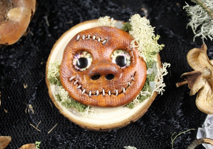 The face was sculpted with polymer clay and then painted. The eyes are glass and the ornament has been accented with an assortment of model bushes, lichen and tumbled stones.