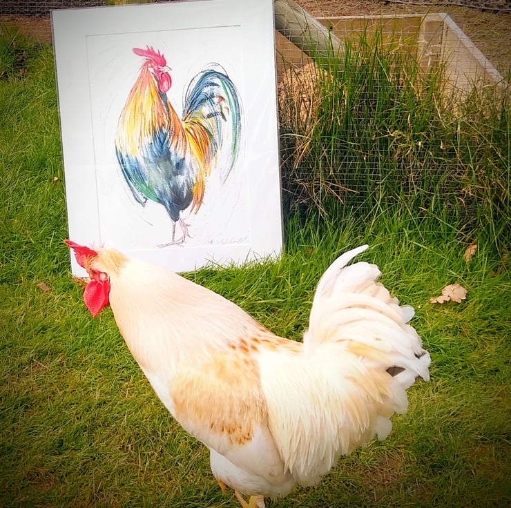 I keep chickens and they are up there with my all time favourite animals. They keep me entertained with their antics and are ever present companions when I'm working in the garden. We have recently acquired a rescue cockerel who is yet to be imortalised in a painting. He is not as colourful as this handsome Leghorn however.