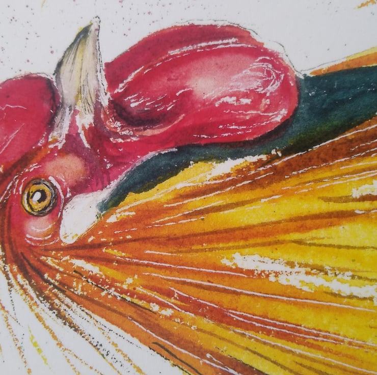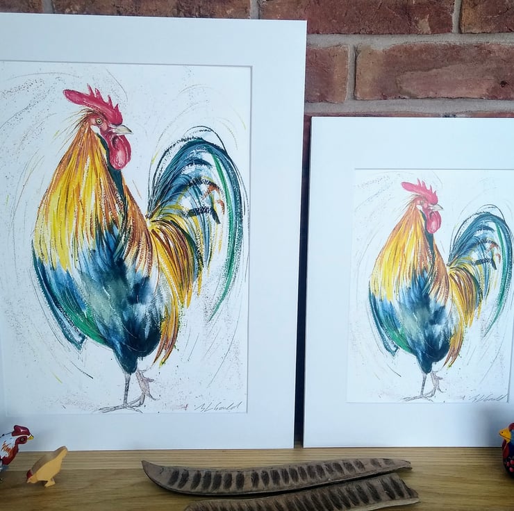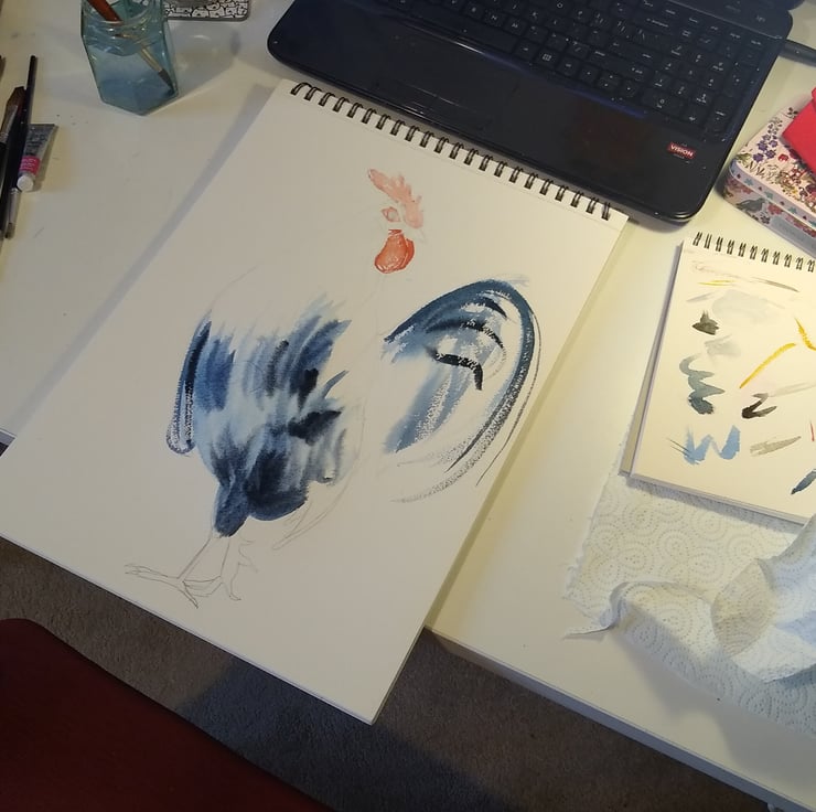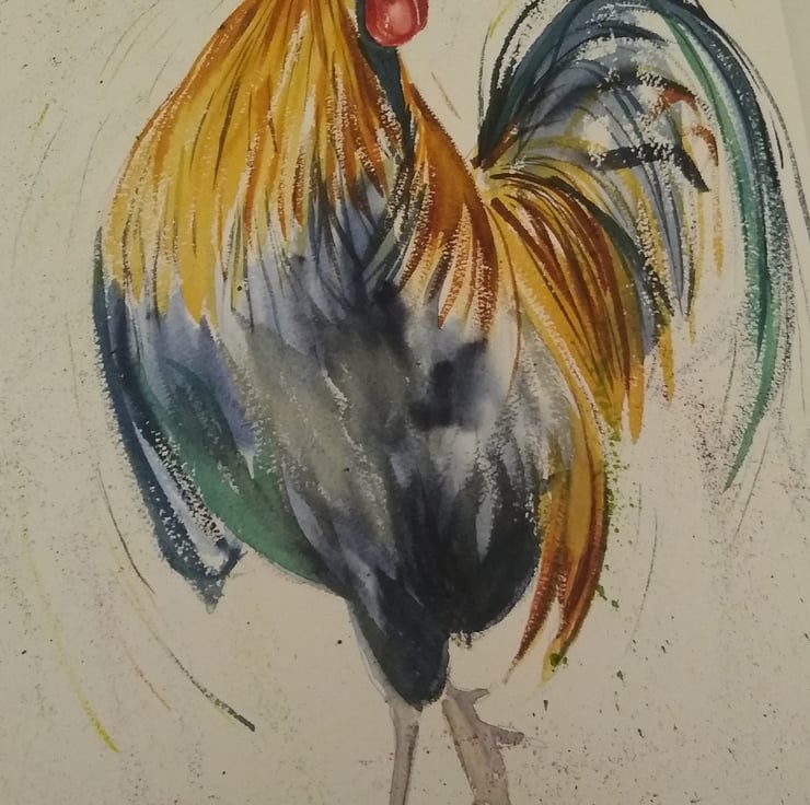 I began this painting with very loose and fluid watercolour using long quick brushstrokes to achieve all those marvelous ruff and tail feathers. Once dry I worked with smaller brushes and in more detail on his head and comb. I used pen to add some more detail. Finally finishing with splashes,speckles and finer lines to give a feeling of movement to the composition.
