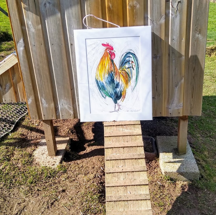 I keep chickens and they are up there with my all time favourite animals. They keep me entertained with their antics and are ever present companions when I'm working in the garden. We have recently acquired a rescue cockerel who is yet to be imortalised in a painting. He is not as colourful as this handsome Leghorn however.