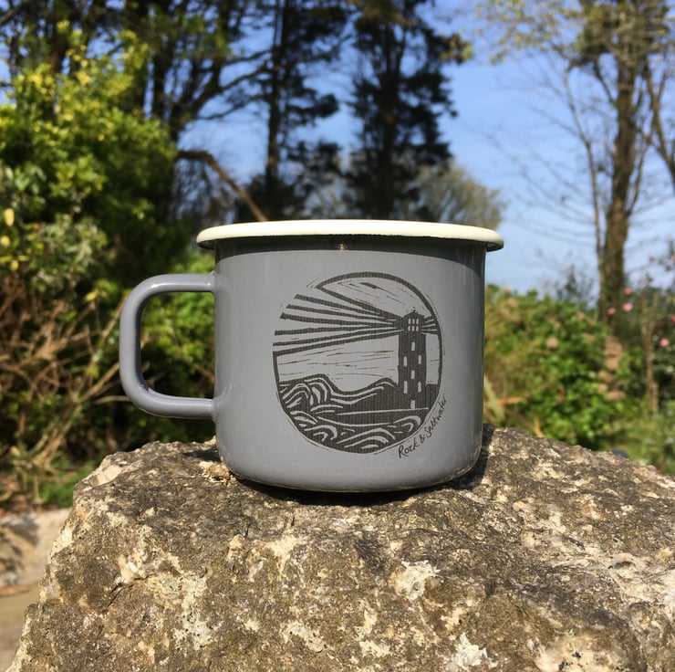 Lighthouse slate grey/cream laser etched enamel mug – large (450ml) size.