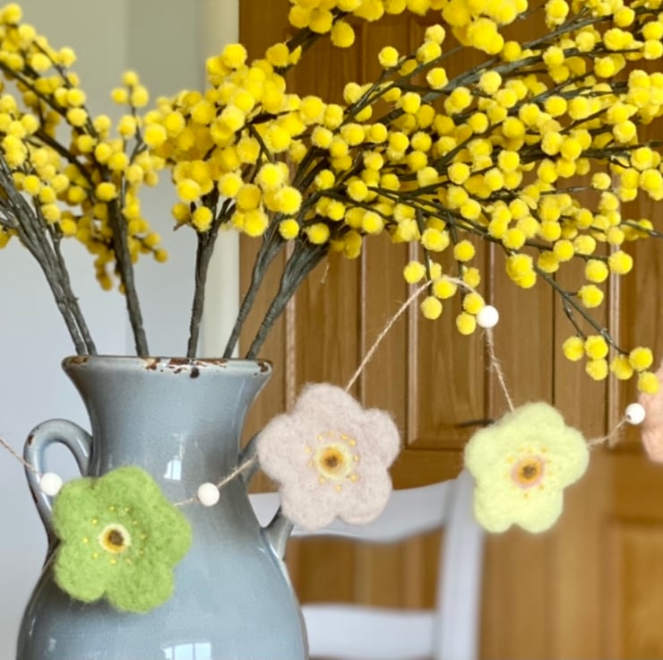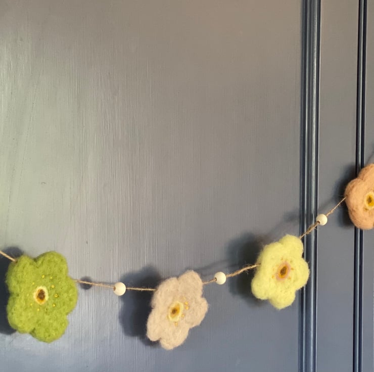 Pretty spring flower garland made with sustainably sourced wool and natural twine and hand embroidered french knots and small wooden beads.