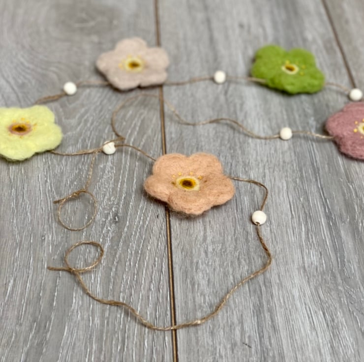 Gorgeous, handmade garland with five pretty pastel flowers and six little wooden beads.