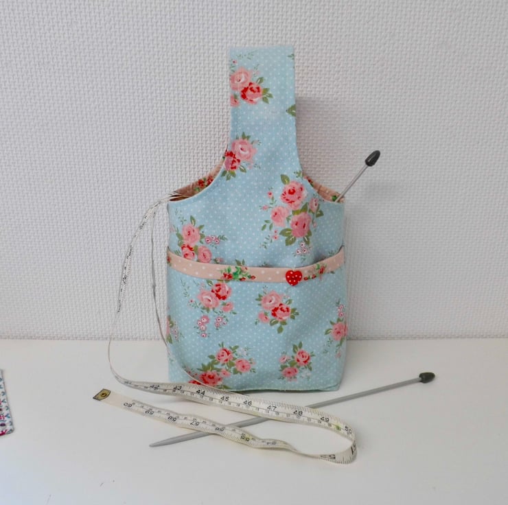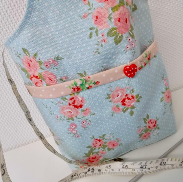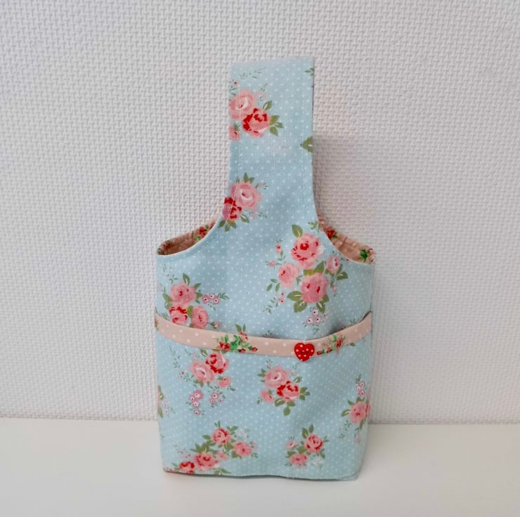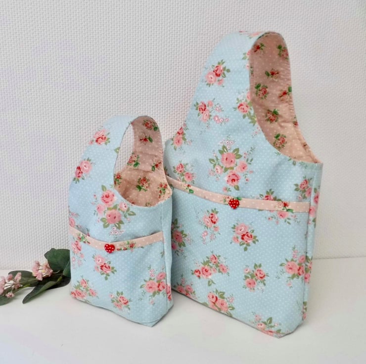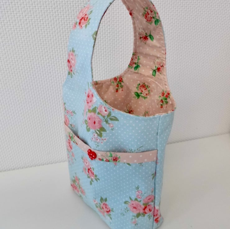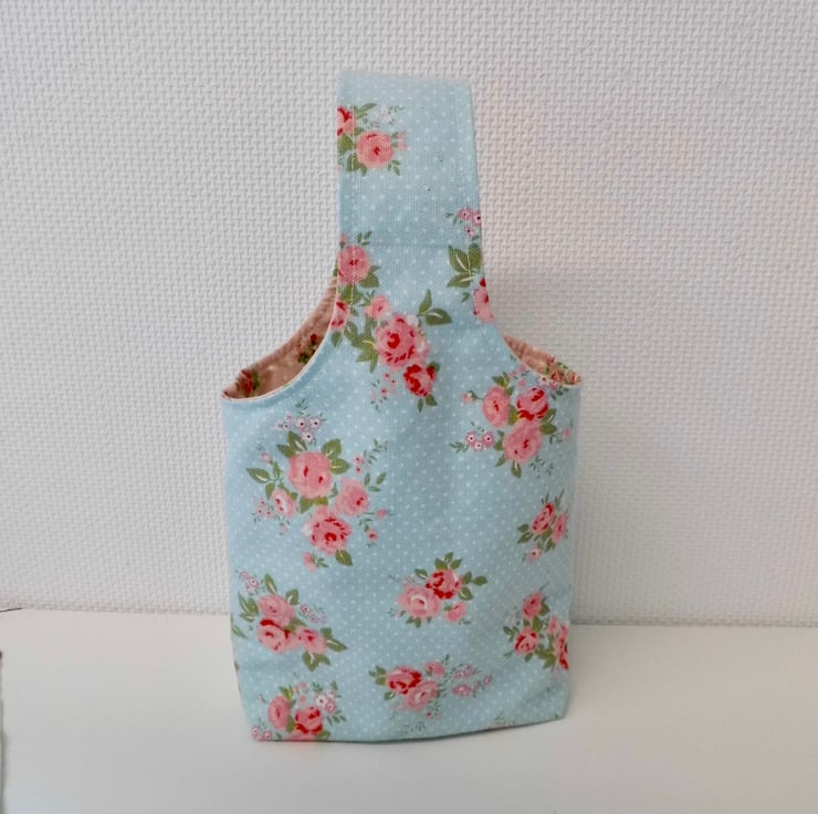 This single handled tote bag is made with a furnishing weight cotton fabric in a pretty vintage style print, blue background with pink roses. Fully lined with a coordinating floral quilting cotton. It's the smaller one of the two you can see together in the photos, suitable for small projects or perhaps for a child.