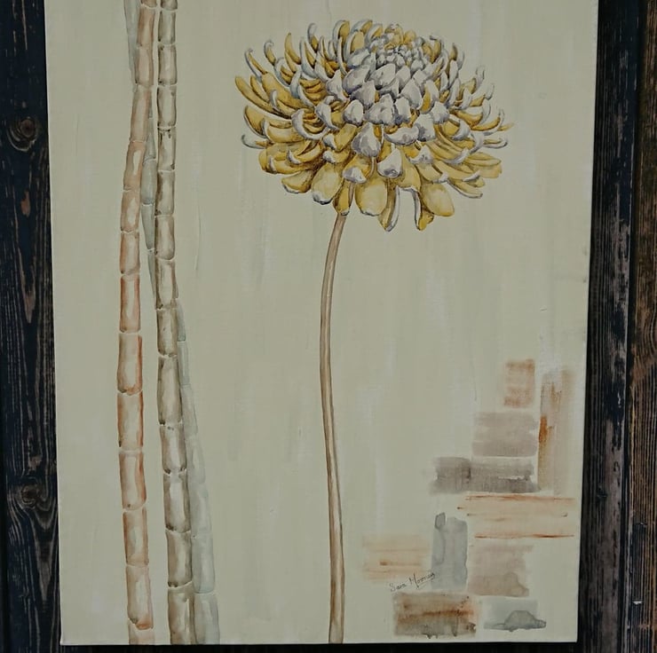 Painting on canvas always makes me a bit experimental. I wanted to break down my composition elements, just concentrating on a single dahlia stem and trying to get those fantastic curled up petals. It is such a sculptural flower to paint. I was going through a bamboo phase at the time so I included stems of that too. It balances out and fills the length of the canvas on the left. The right corner seemed a bit empty so I had fun using all the tonal colours within the painting as notations in watery brush strokes. I liked the composition so I decided to make another featuring chrysanthemums this time. Because of it's colour, I wondered if this painting might make a unique golden wedding present.