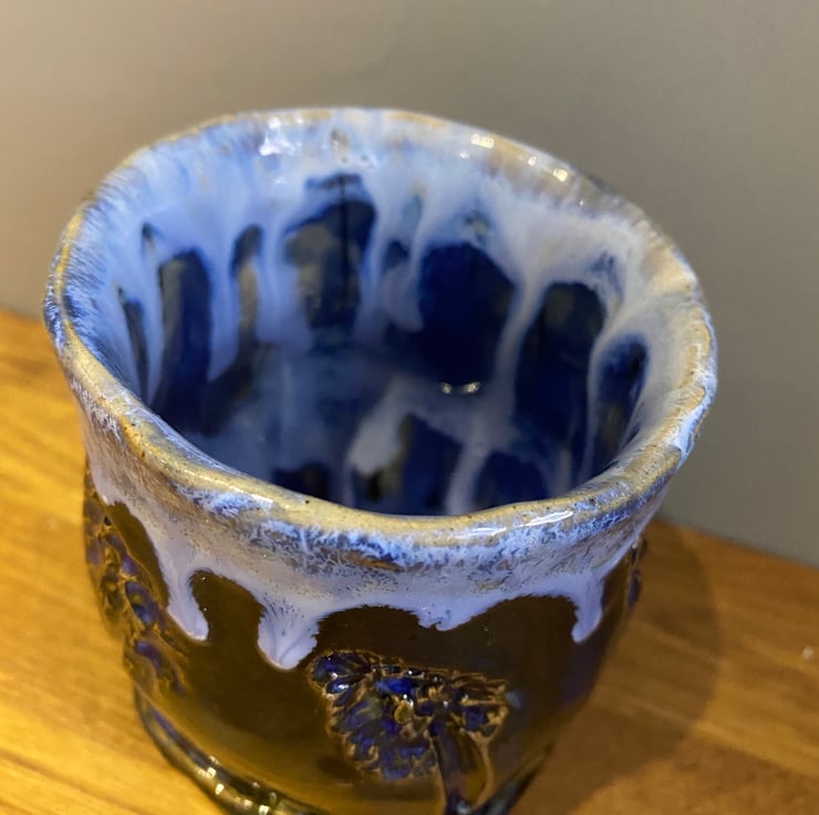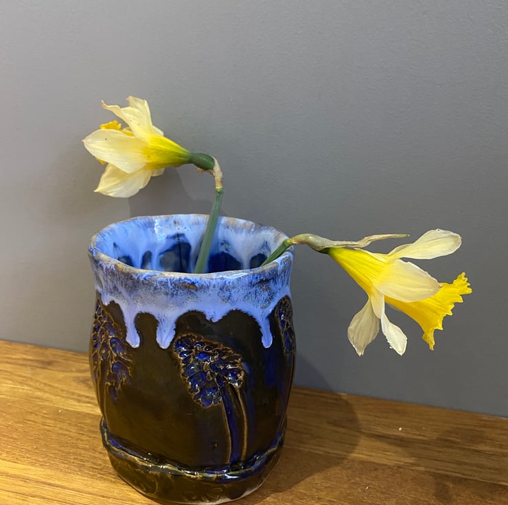 Unique one off vase, handmade with a slab of clay and impressed with blue hyacinth flowers from my garden. Dark blue with a light blue drippy glaze around rim. Height 9cm diameter 8cm.