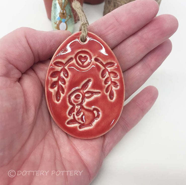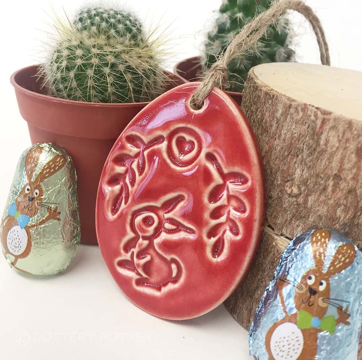 This cute little pottery Easter Egg decoration is hand cut from white earthenware clay, fired once, a rich glossy green glaze is applied and it is then fired again - so is nice and strong. This is the price for ONE egg. It measures 6.5cm x 4.5cm and hangs from a cream organza ribbon It is glazed on the front and left plain on the back.