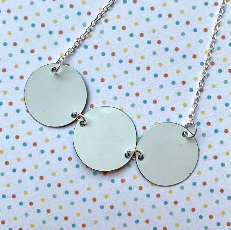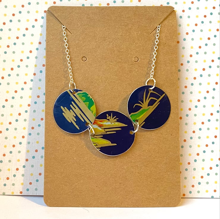 These three 20mm circles have been hand cut from a vintage Daher oriental themed tin dish as shown in the photos. Each disc features a section of an outdoor waterside scene in gold with hints of green and orange on a dark blue background. Joined together with silver plated rings, the circles hang on a 17 inch long fine silver plated chain with a lobster clasp closure.