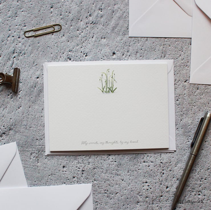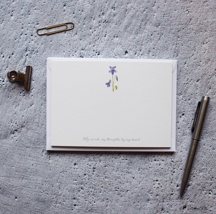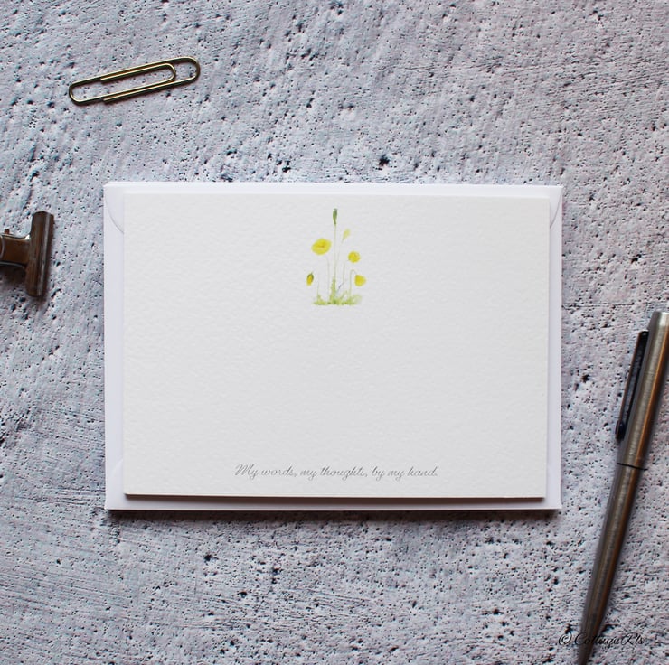 The Wildflower designs were all originally hand painted in watercolour by us a CottageRts before being printed on to A6 linen effect 300gsm postcards. The set contains three different designs including a Violet, Yellow Poppy and a Snowdrop. You will receive four of each design which is twelve cards in total. The bottom of each card reads ' My words, my thoughts, by my hand'. The back of each card is blank for your own message.