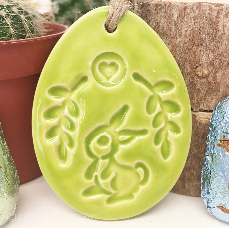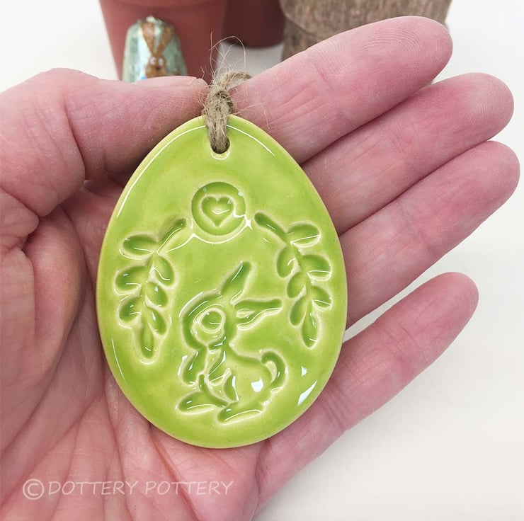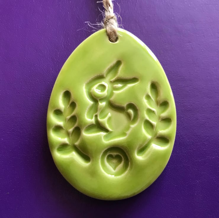 (The egg you will be getting is the one photographed on the purple background with the leaves on the bottom) This cute little pottery Easter Egg decoration is hand cut from white earthenware clay, fired once, a rich glossy green glaze is applied and it is then fired again - so is nice and strong. This is the price for ONE egg. It measures 6.5cm x 4.5cm and hangs from a cream organza ribbon It is glazed on the front and left plain on the back.
