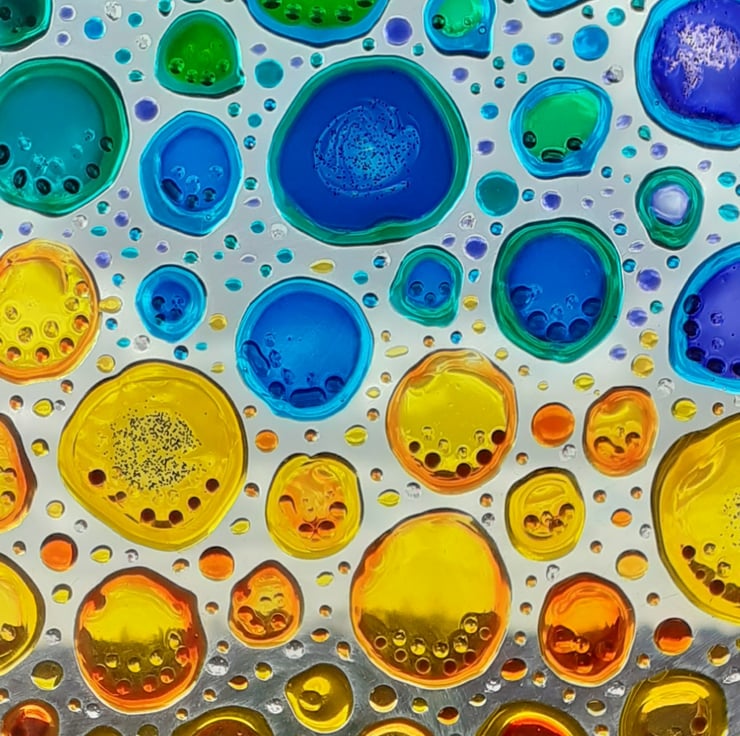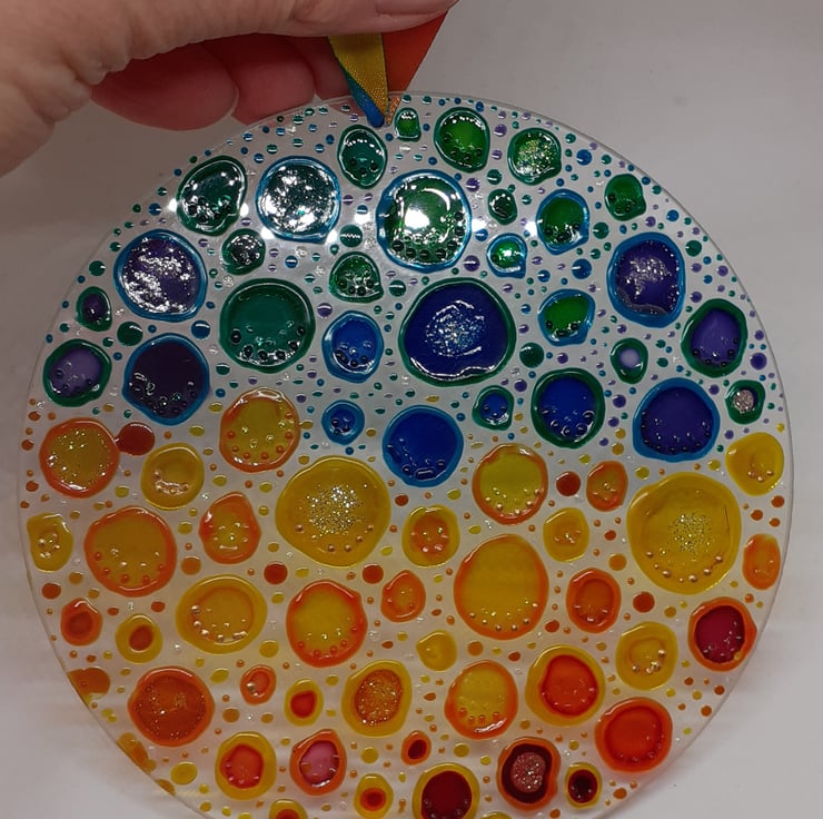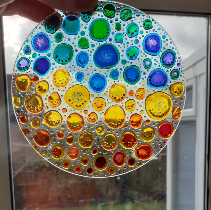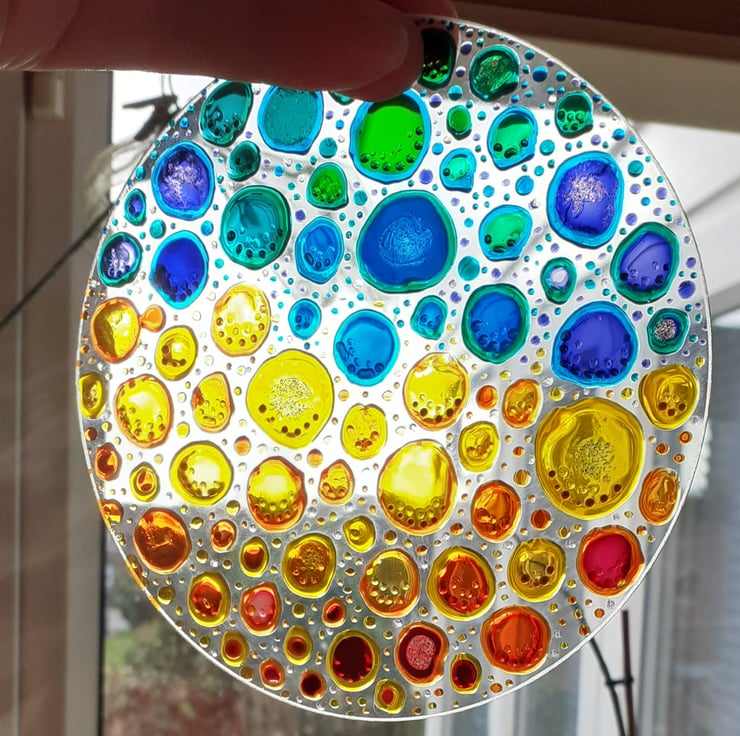 This Bubble sun catcher is made from thin glass and has been painted in an abstract bubble pattern using glass paints and out-liners.