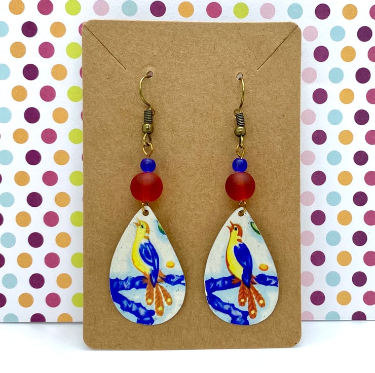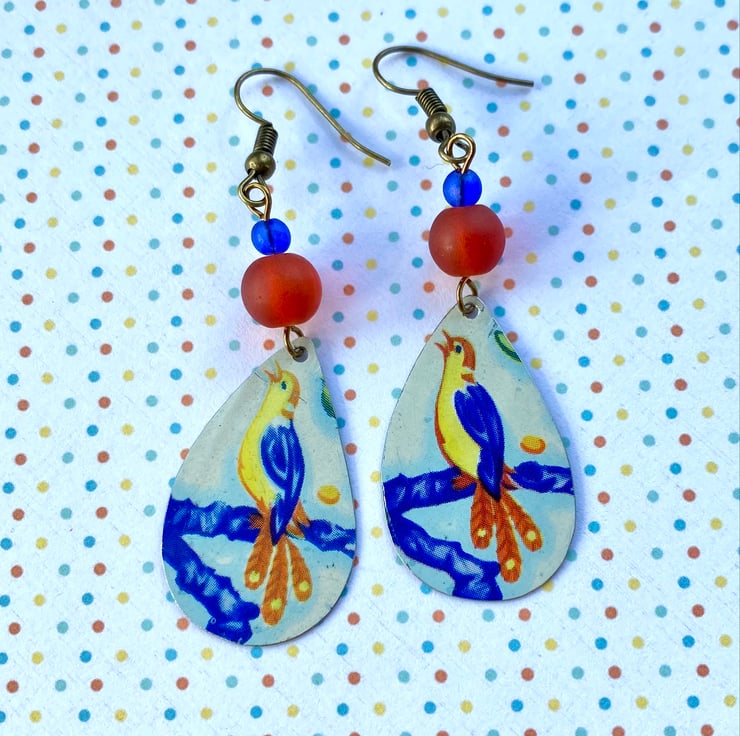 Wear a piece of the past with these gorgeous singing bird earrings! The teardrop shapes have been hand cut from a vintage Daher decorative tin dish and smoothed around the edges. The pretty blue, orange and yellow bird sits on a dark blue branch on a pale blue background. Frosted glass beads have been added that complement the colours.