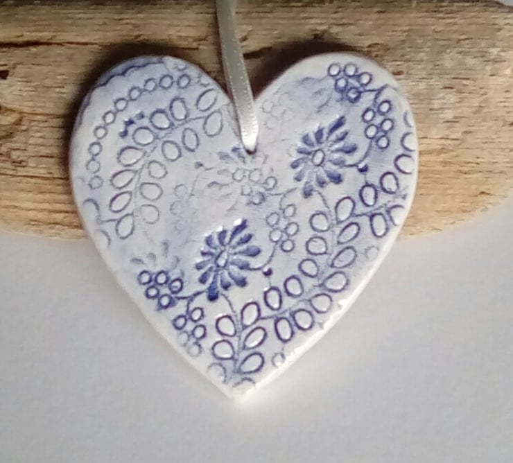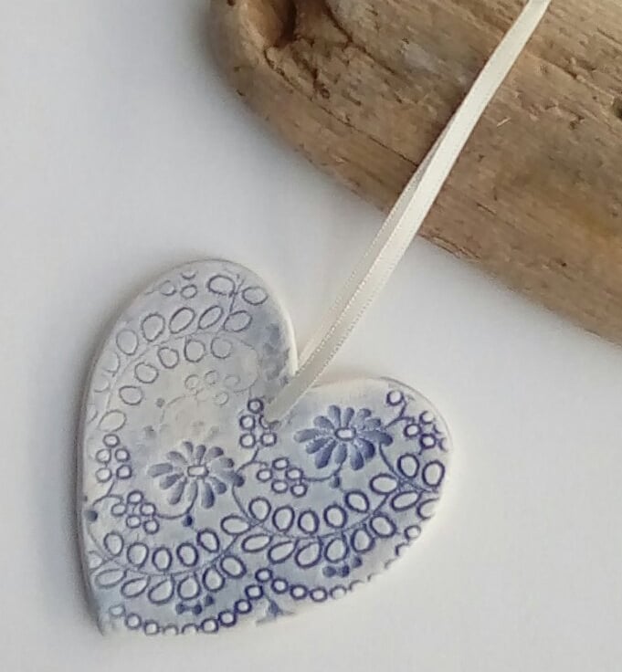 This is a lovely ceramic heart decorated with a blue flower imprint.