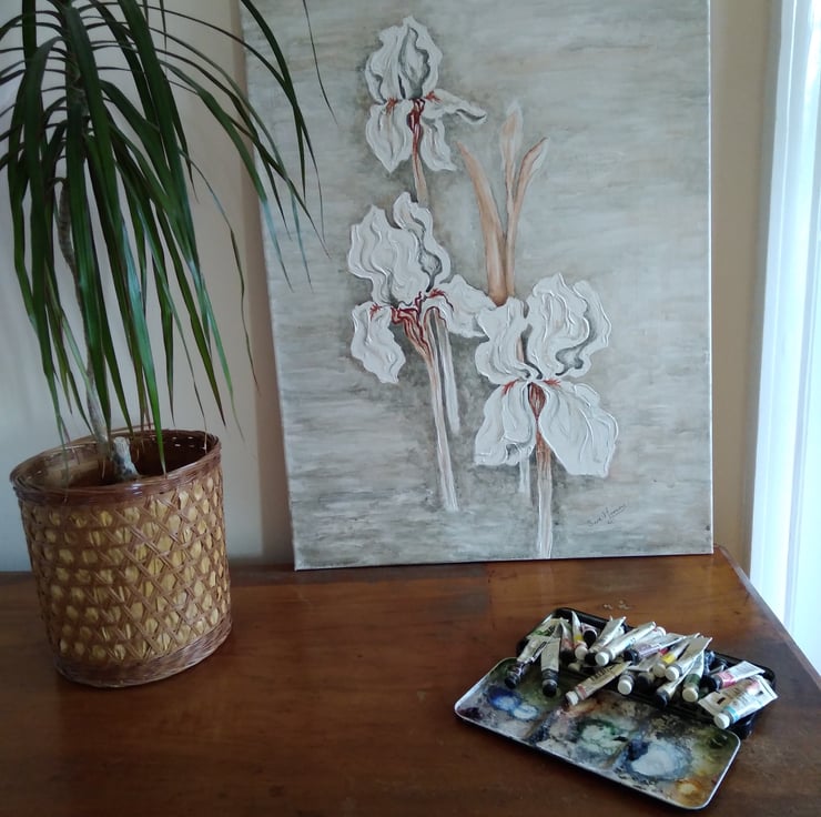 An original white iris painting on canvas featuring 3 blooms, 2 buds and a leaf. The art-work was created in my Norfolk studio where I used gouache to achieve the folds and crinkles of the papery petals and for the background which continues around the edge. I painted the detail and shadow with my favourite watercolour. The background is an atmospheric mix of burnt sienna and Prussian blue tones allowing the lilies to take centre stage. The painting measures 70cm 50cm x 1.5cm and is ready to hang. The colours are very subtle offering maximum chances to join in with your own colour scheme. I have called this one Iris study II