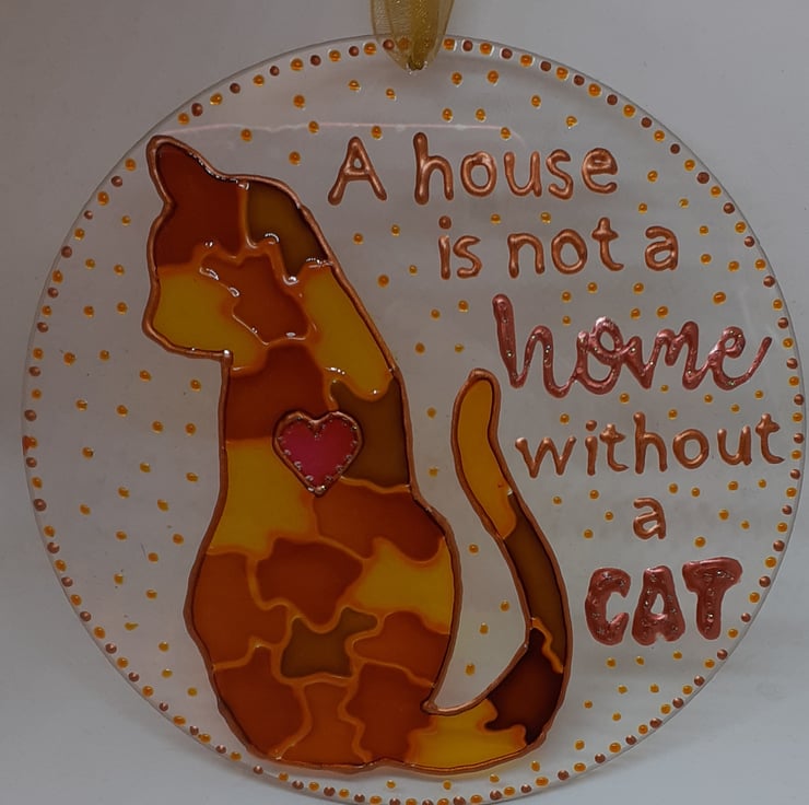 This sun-catcher is made of glass and a cat has been painted onto it using glass paints. The colours represent a ginger/orange cat!.