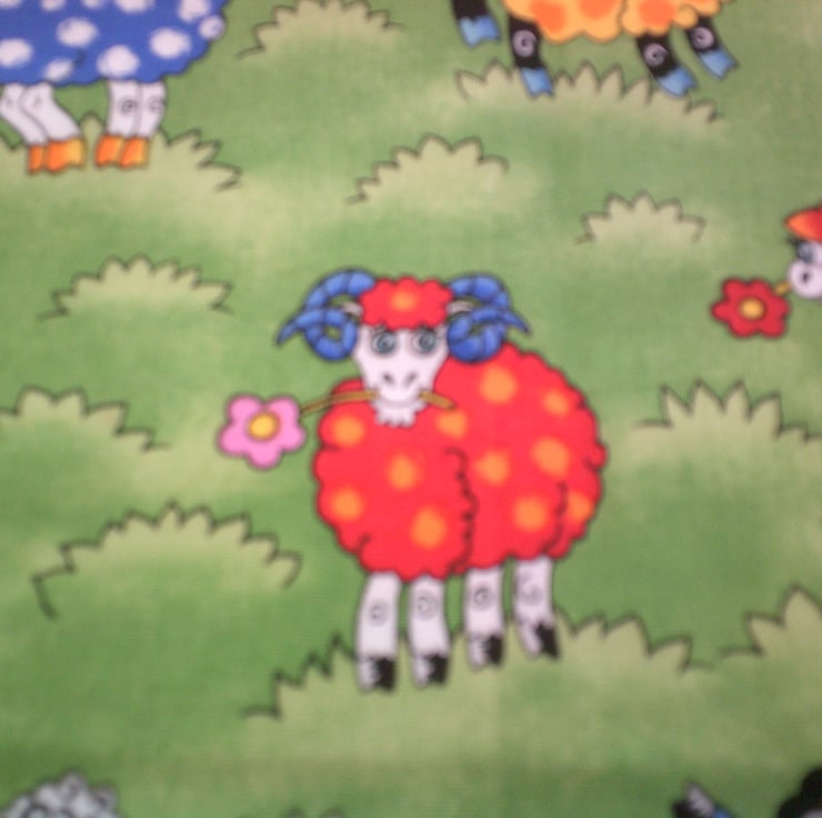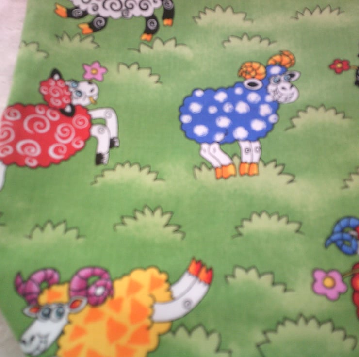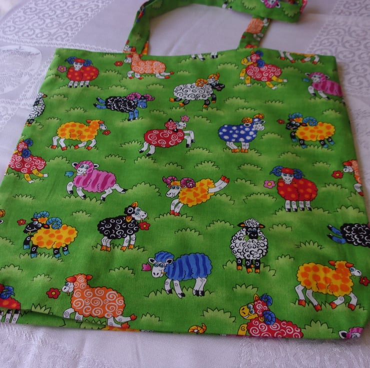 This Eco Friendly, fabric bag is made using 100% Cotton and is of Multi coloured comical sheep on a green field background (both sides are the same design) and is fully lined.