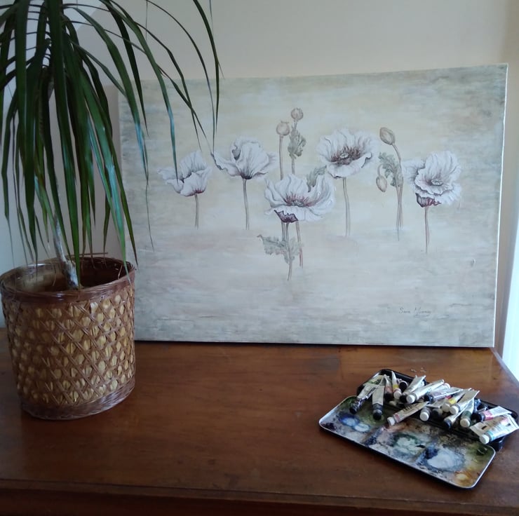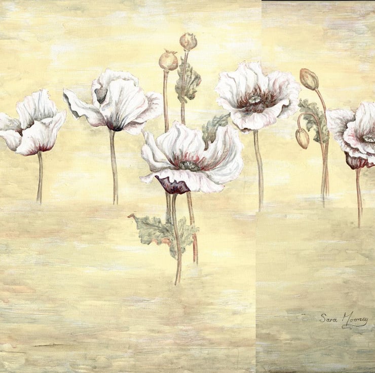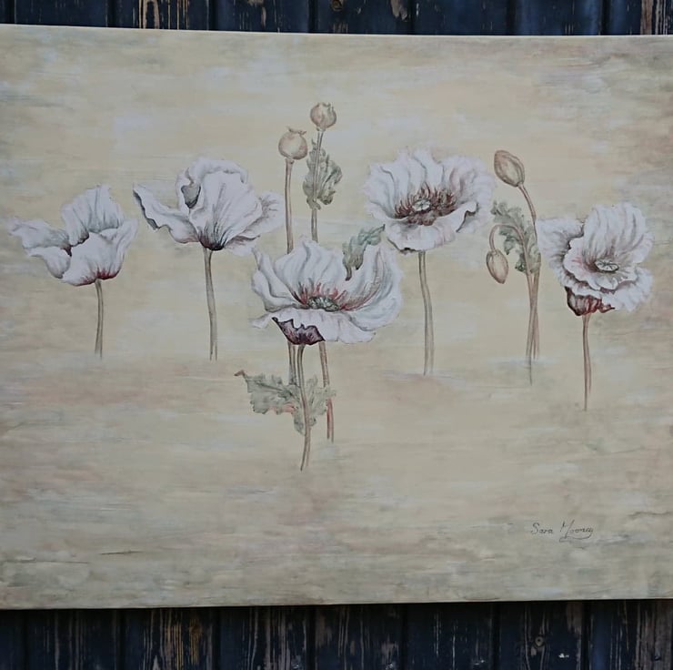 An original painting featuring 5 poppy stems, 2 buds and 2 seed pods which are floating in a misty watercolour background. The painting has been created at my Norfolk studio and I have used gouache for depth and texture on the papery poppy petals. Watercolour enables the detail and shadow. A cream background has misty hints of the pinks and greys within the painting which continues around the sides. The painting is horizontal and measures 70cs x 50cm x 4cm. It is ready for you to hang. I hope the combination of the warm tones works for your space. I have called this one 'Poppies in the Mist I'.
